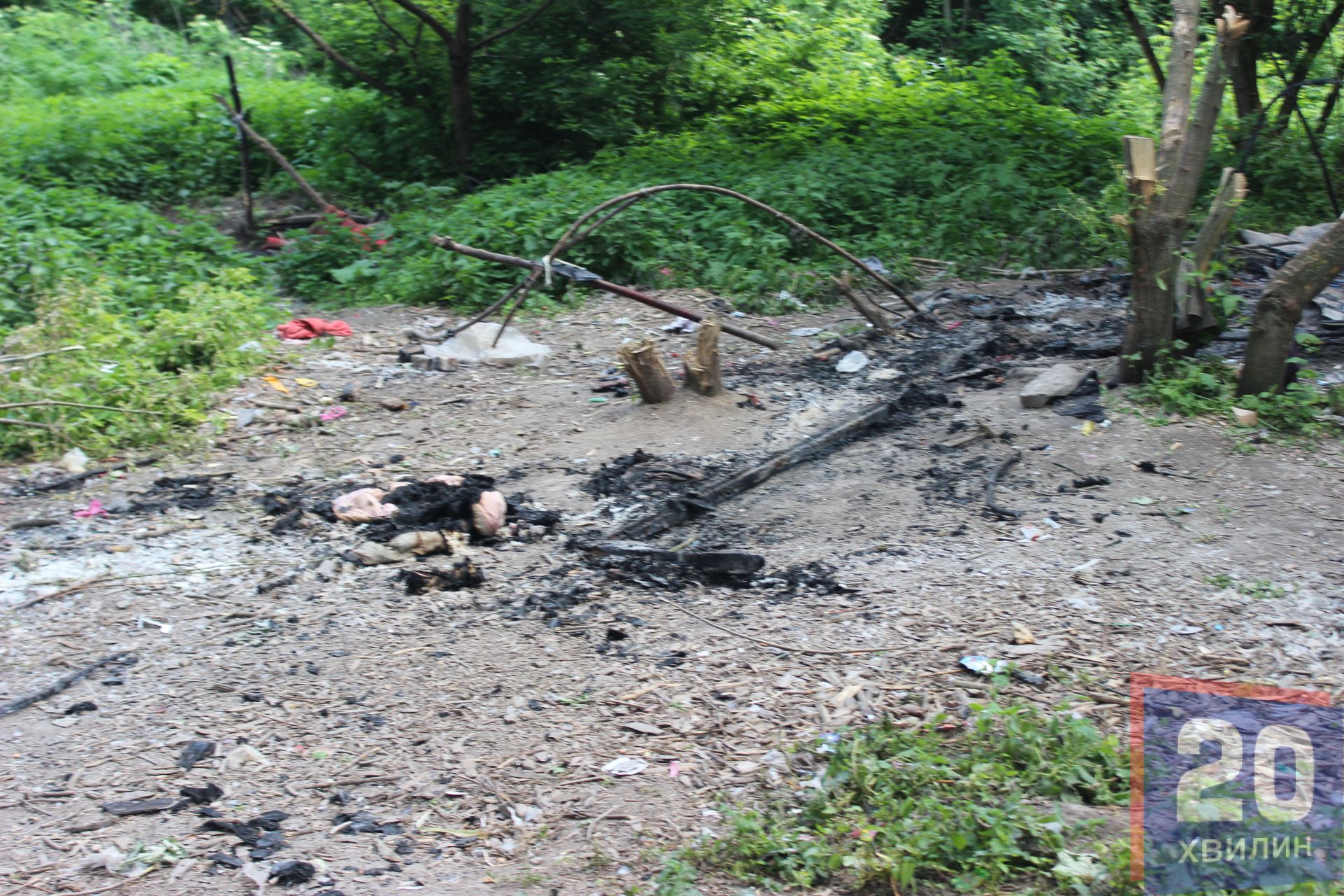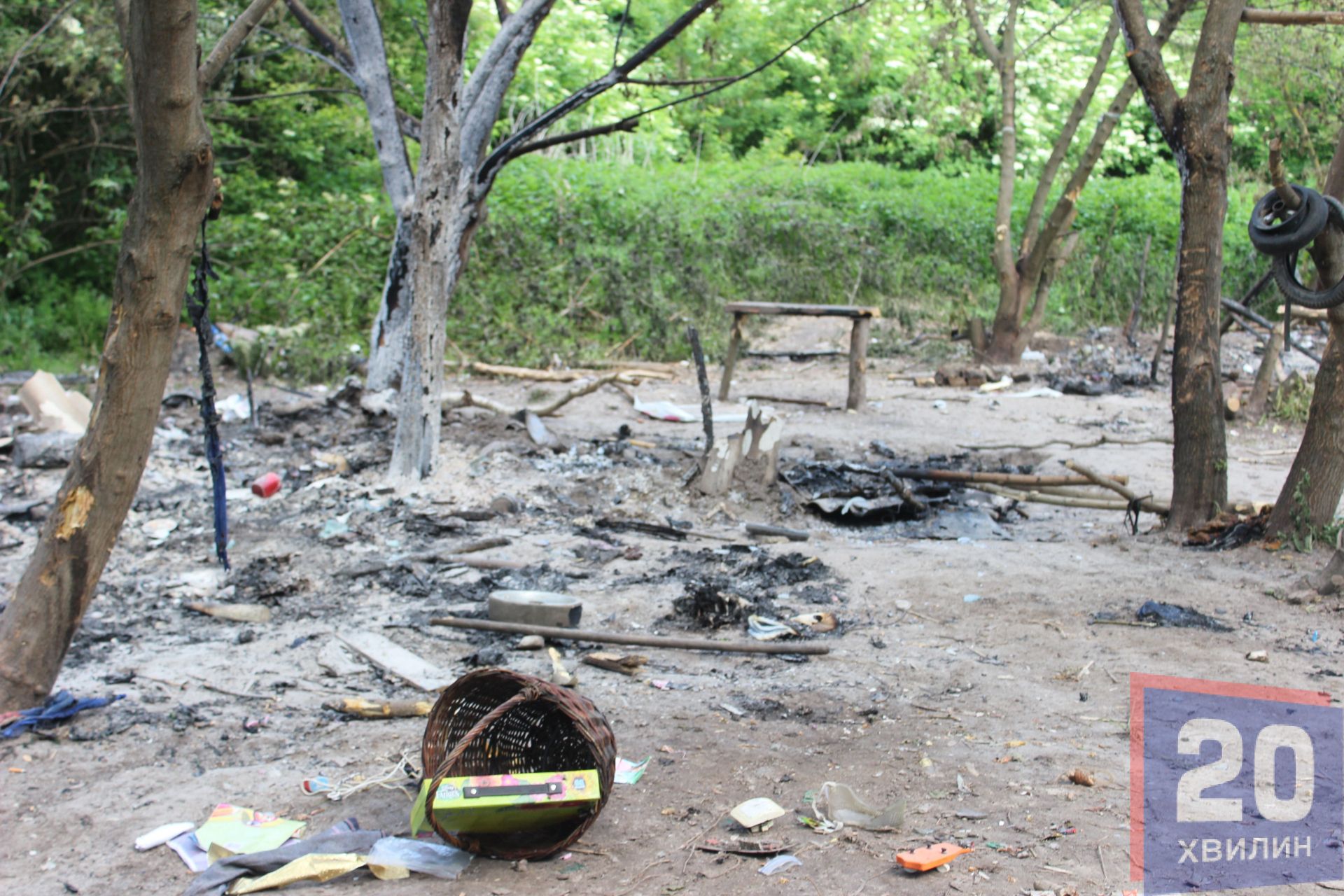 На місці розташування ромів залишились спалені каркаси від наметів, поламані дитячі іграшки та обгорілі речі. Зараз у таборі порожньо. Лише працюють оперативники.