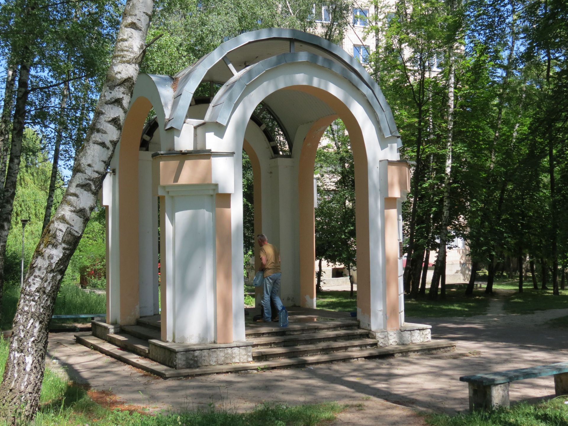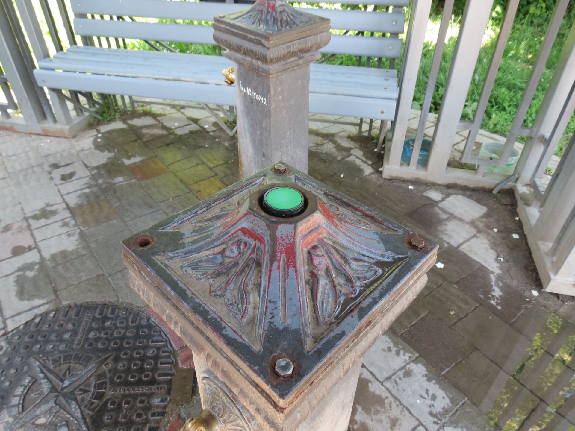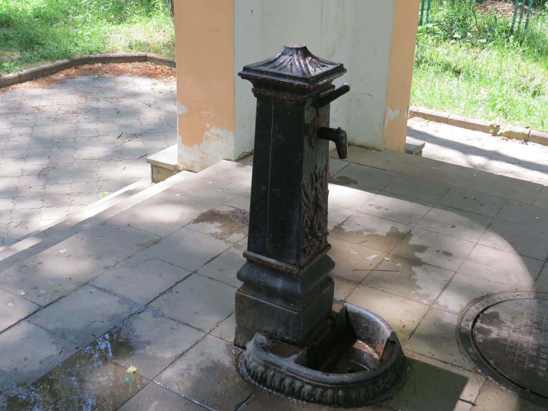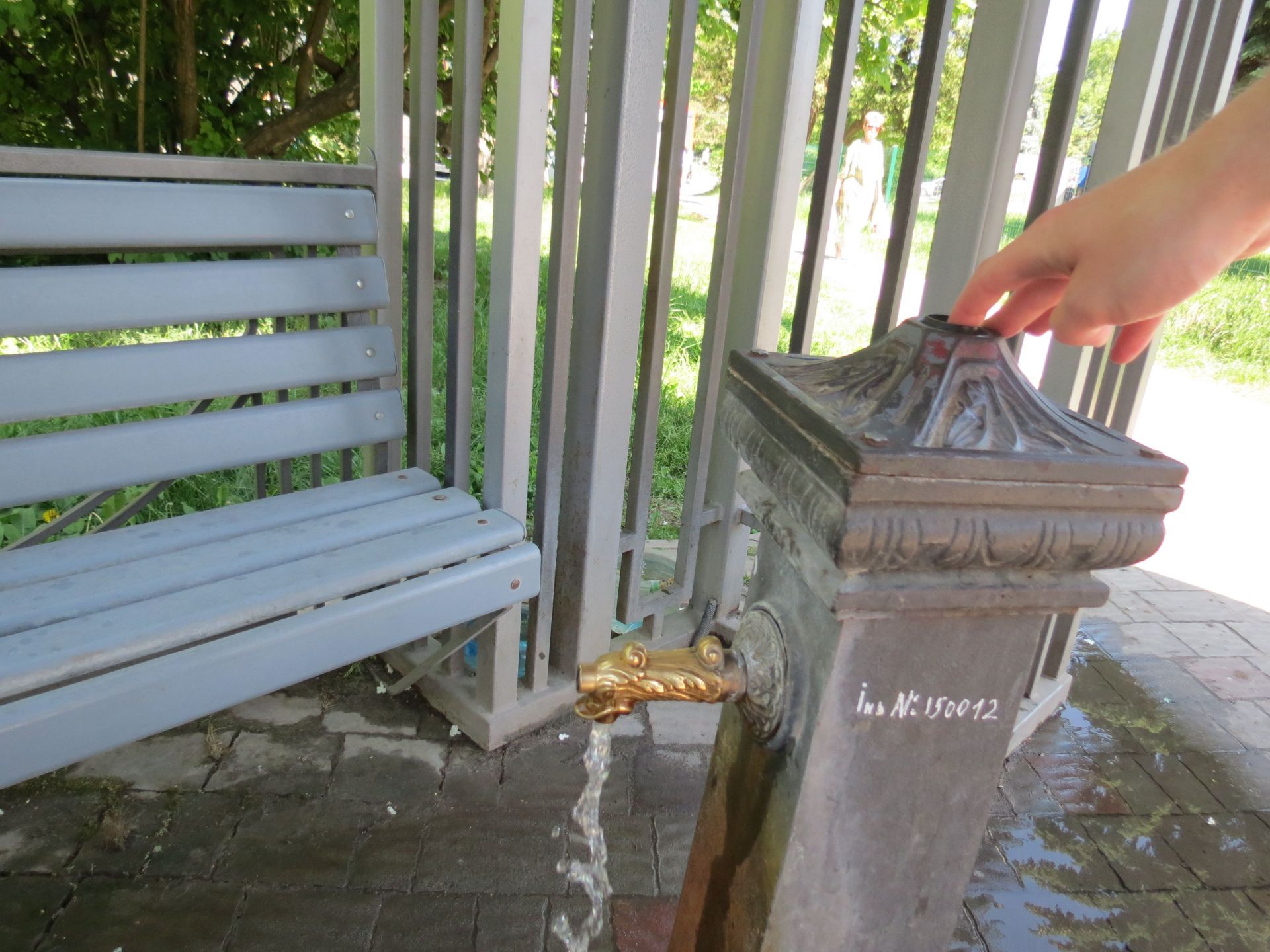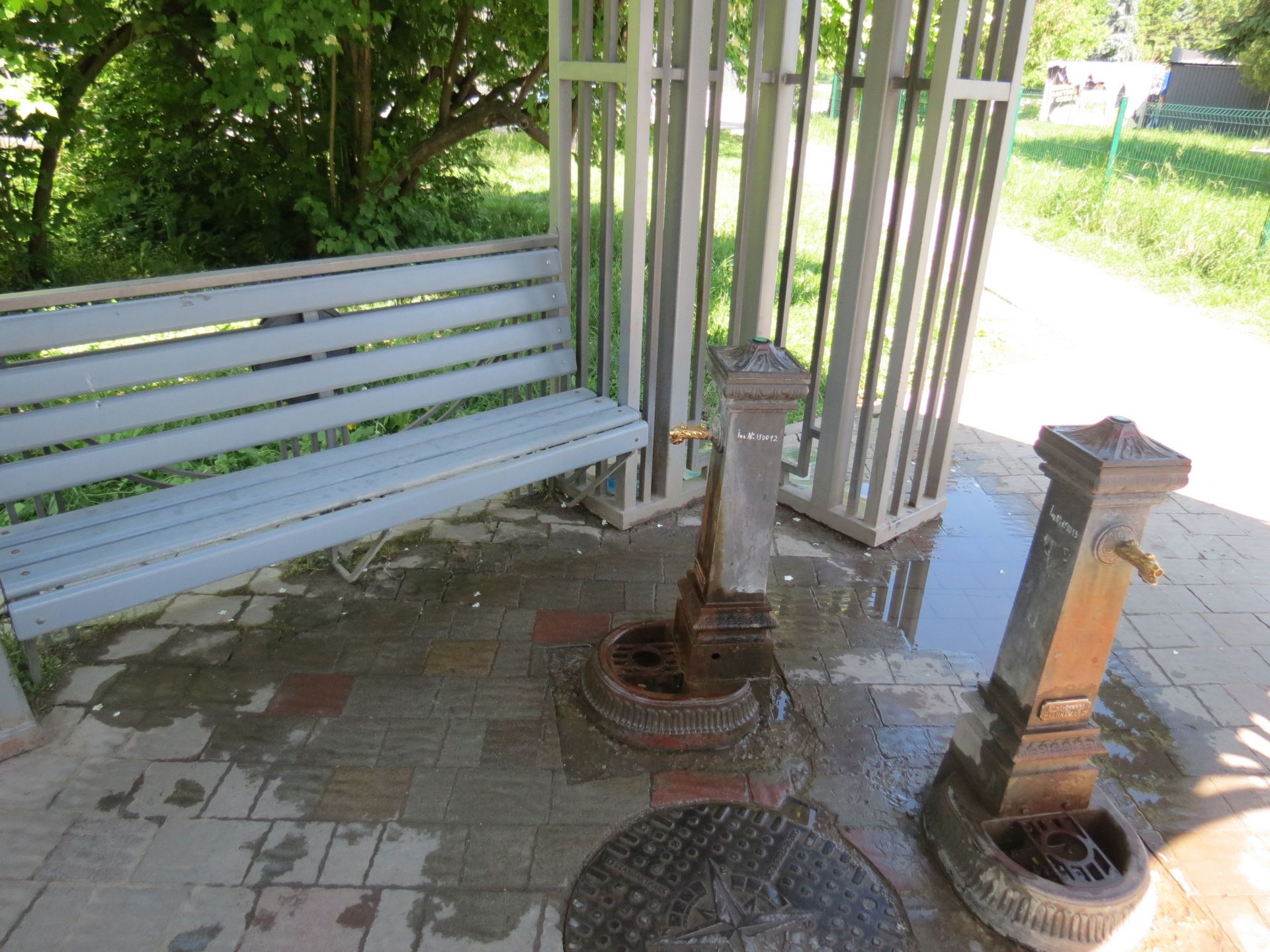 У сірій металевій альтанці є дві колонки. Воду можна набрати, натиснувши на кнопку. Вона фактично відразу починає текти після натискання. Поруч є кілька лавок. Також є освітлення.