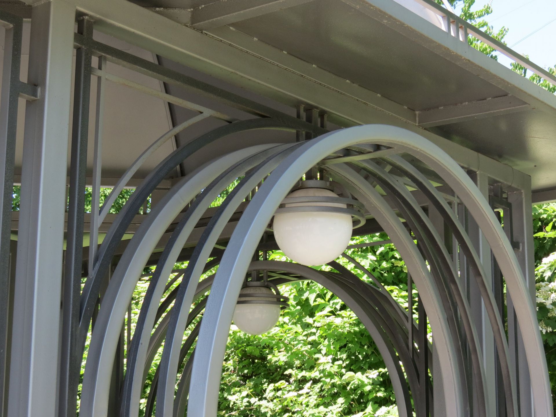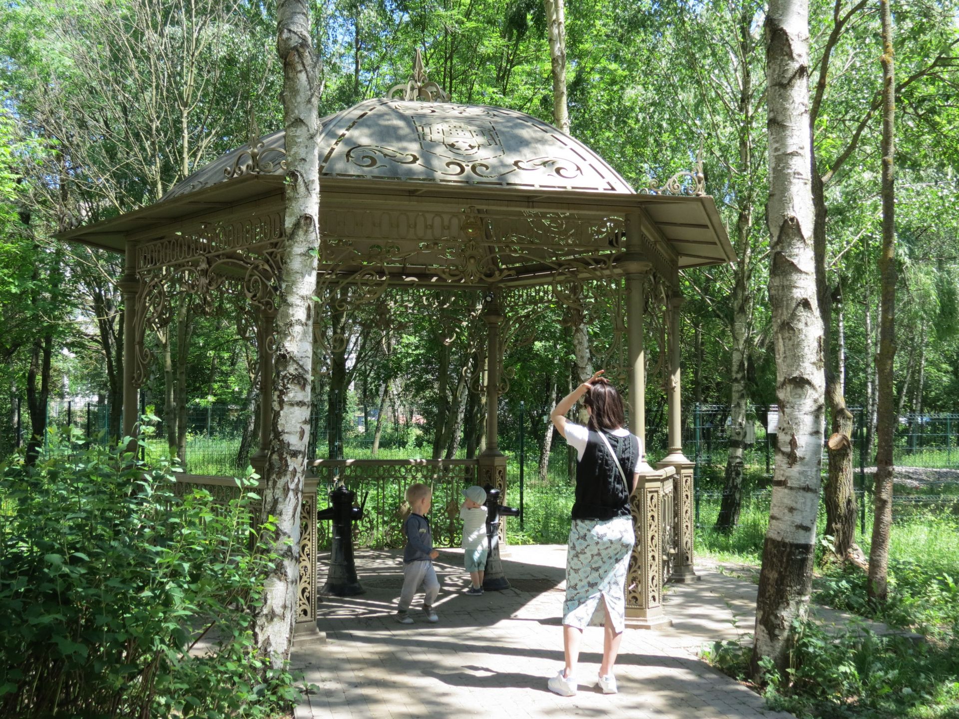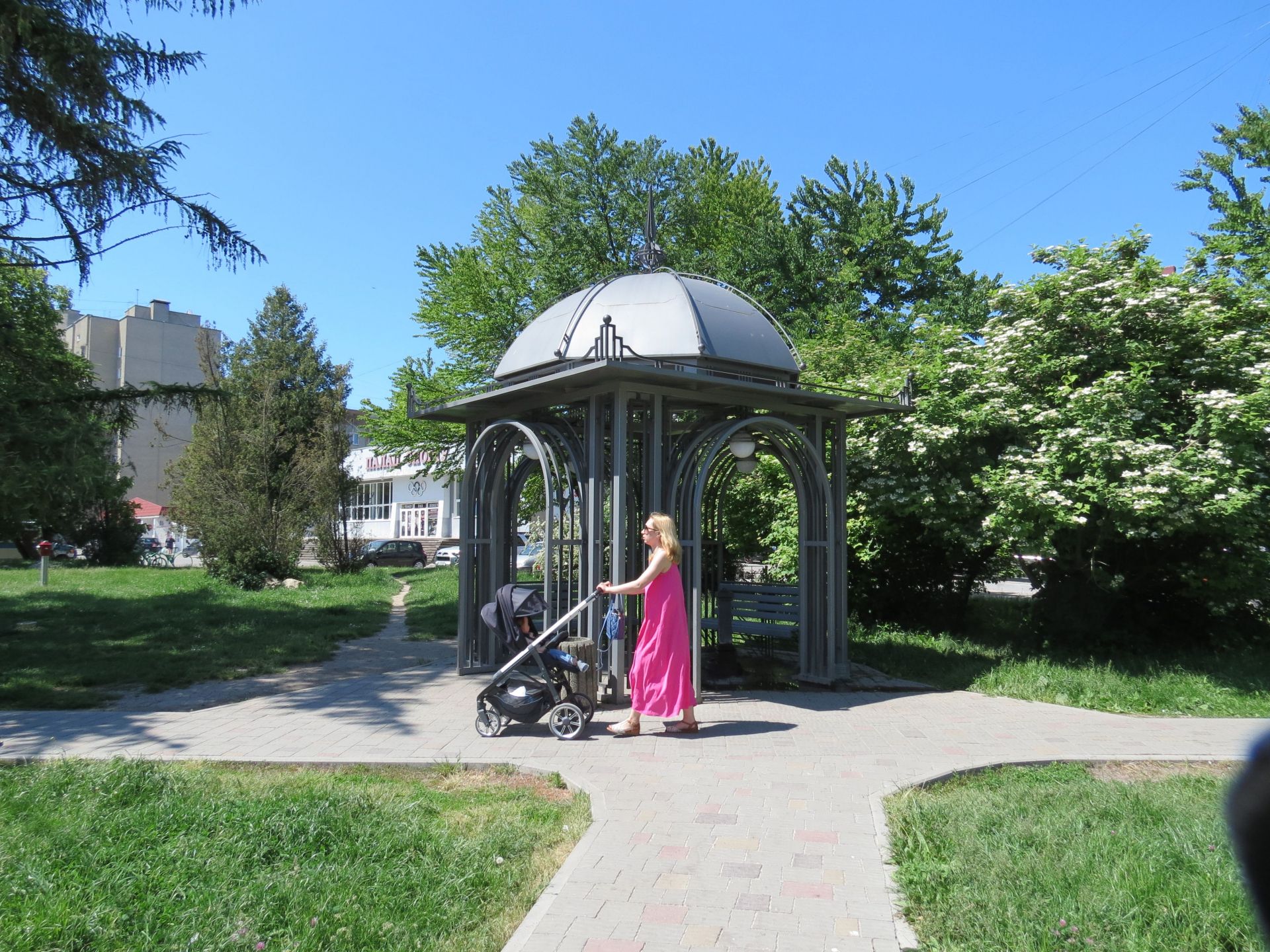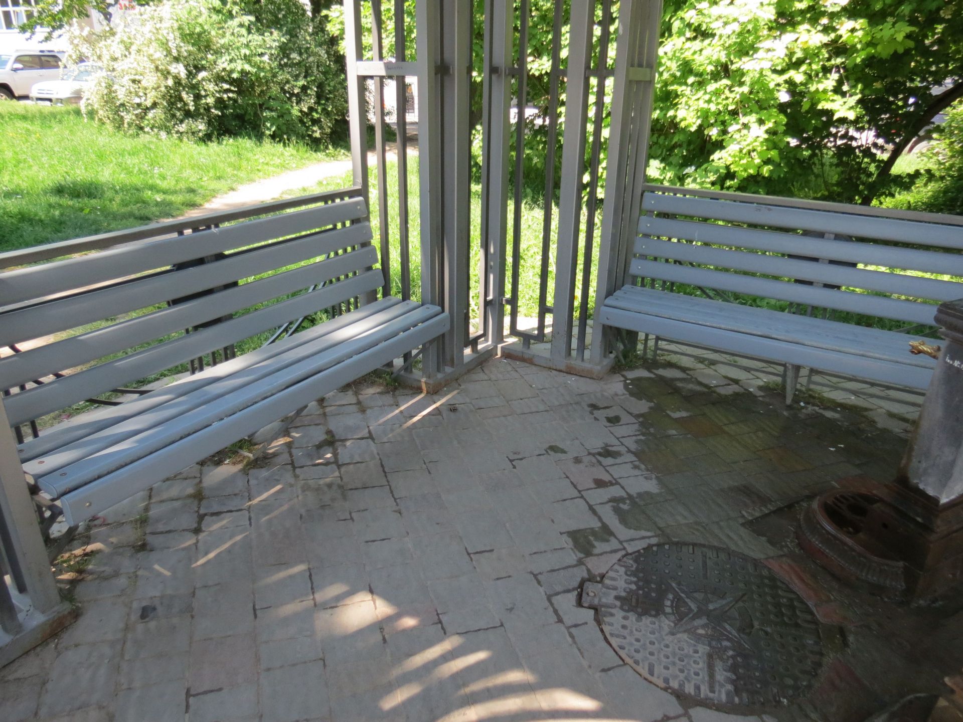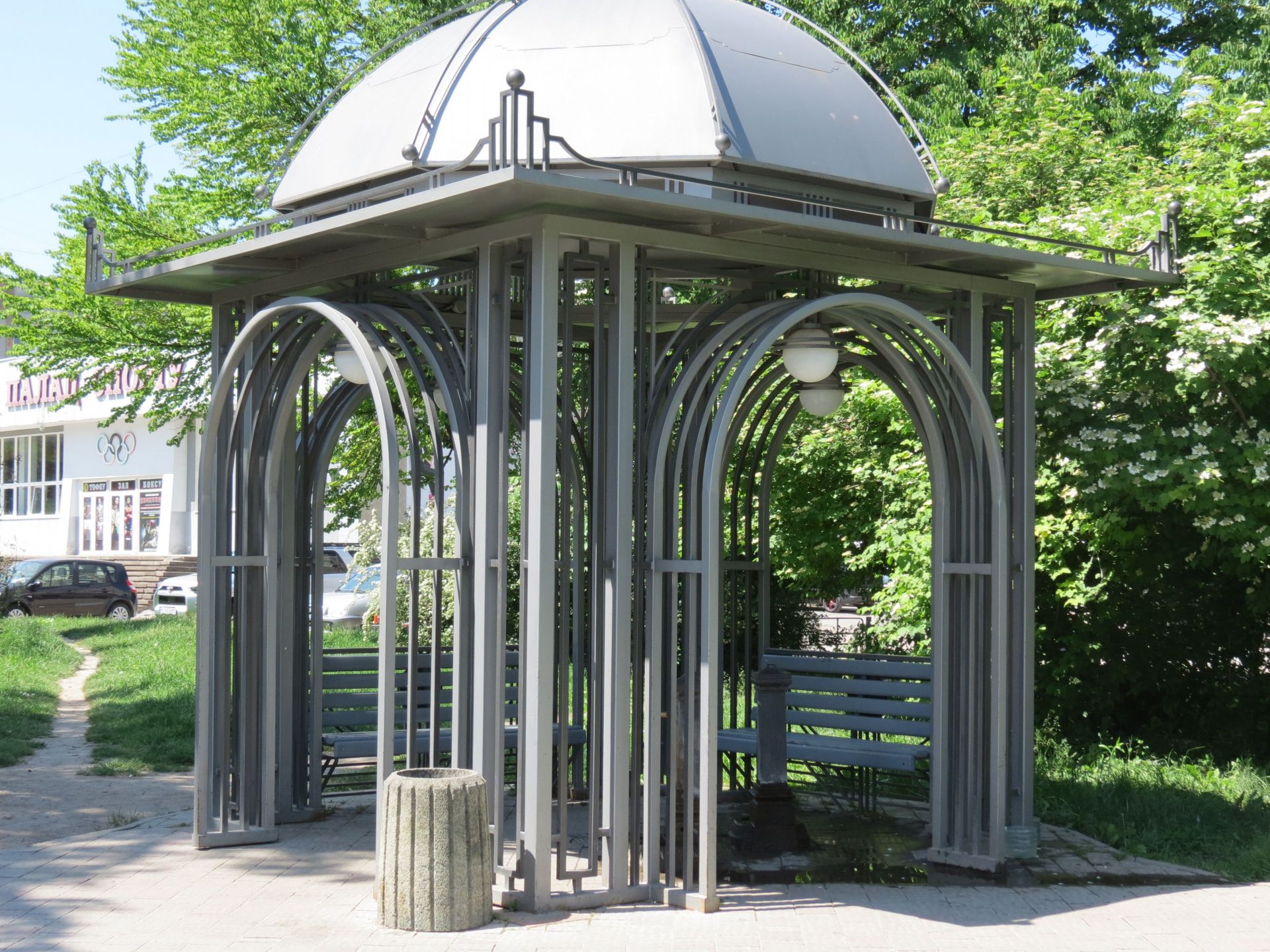 У сірій металевій альтанці є дві колонки. Воду можна набрати, натиснувши на кнопку. Вона фактично відразу починає текти після натискання. Поруч є кілька лавок. Також є освітлення.