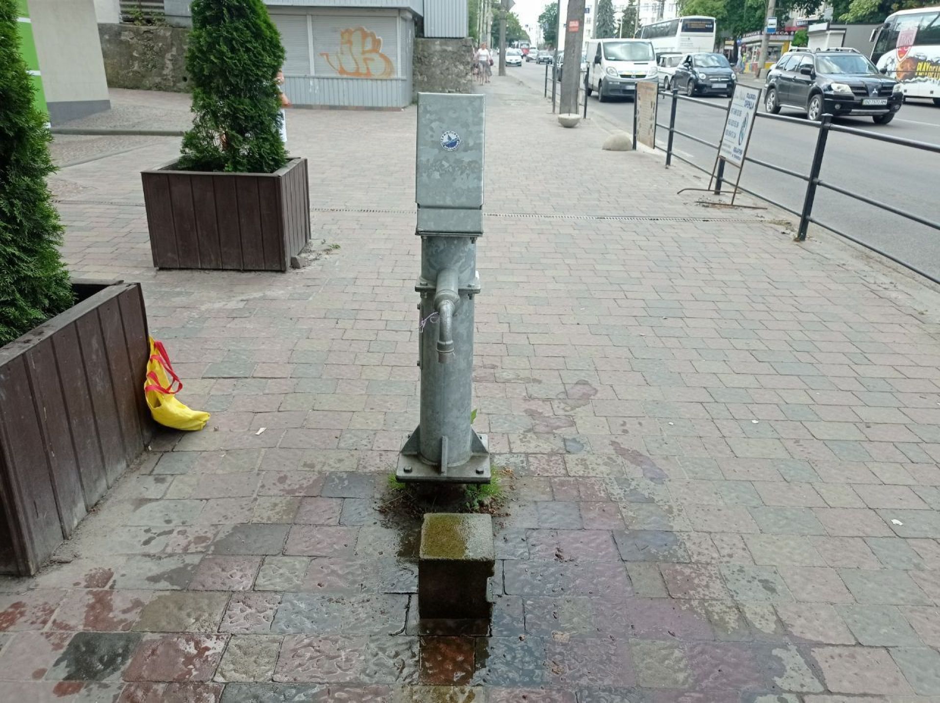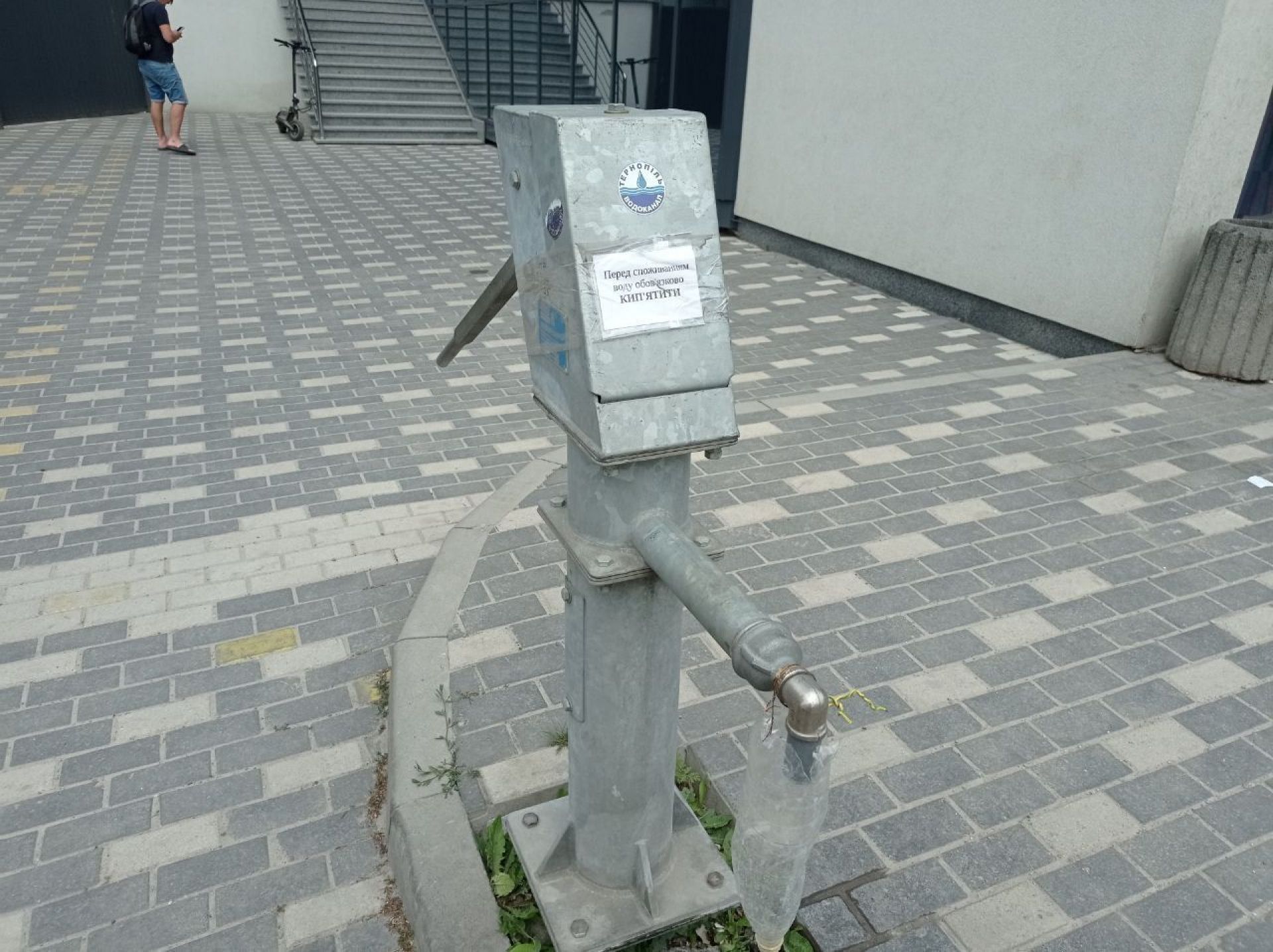 Нова колонка є і біля зупинки на вулиці Острозького, 45. Вона також працює. Ми помітили, що нею користуються часто – навколо була мокра земля.