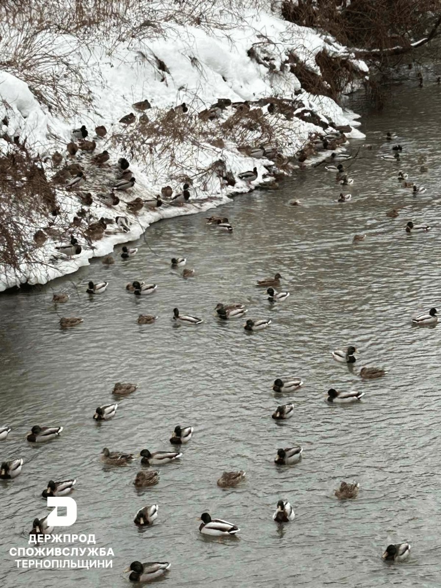 У холодну пору року чимало диких качок залишаються зимувати на незамерзаючих водоймах. Цієї зими велика кількість птахів перебуває на річці Стрипі в місті Бучач. Фахівці пояснили, чим категорично неможна підгодовувати птахів.