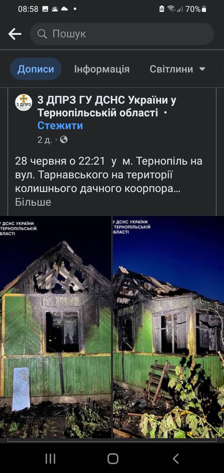 Так, 28 червня о 22:21 у м. Тернопіль на вул. Тарнавського на території колишнього дачного кооперативу теж виникла пожежа в дачному будинку.