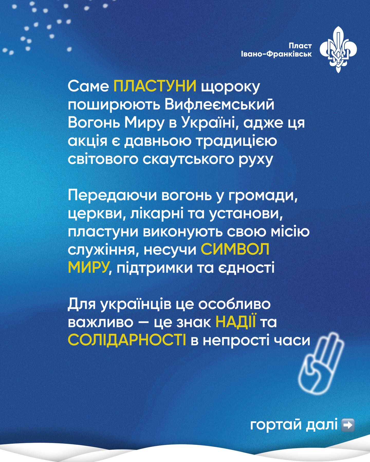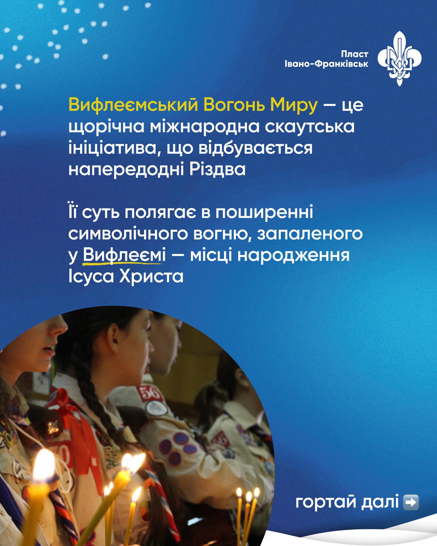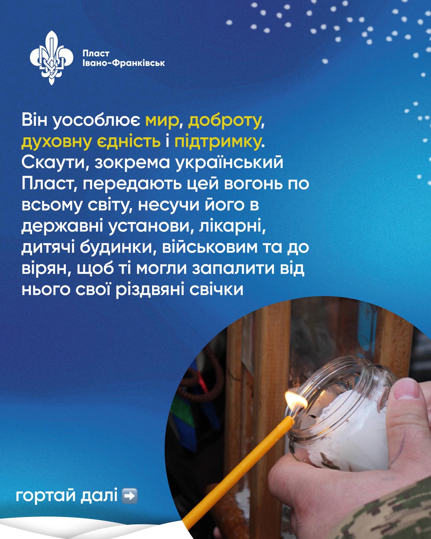 — Наближається час різдвяних традицій та щорічної передачі Вифлеємського Вогню Миру. 12 грудня о 18:00 у монастирі Отців Василіян відбудеться передача Вогню. Це щорічний символ миру та єдності, який пластуни передають далі громадам та родинам, — йдеться в повідомленні.