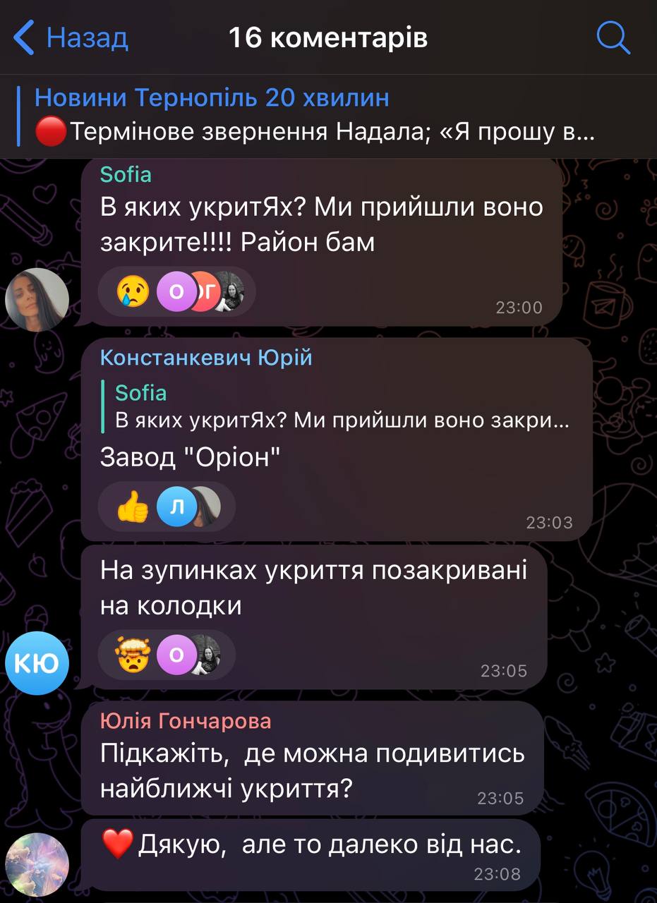 - «Куди нам бігти, якщо укриття зачинені» — саме такі повідомлення під час нічної атаки надсилали тернополяни до редакції «20 хвилин».
