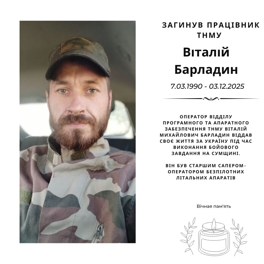 Віталій Михайлович Барладин (07.03.1990 – 03.12.2025) був оператором відділу програмного та апаратного забезпечення ТНМУ. Він віддав своє життя за Україну під час виконання бойового завдання на Сумщині.
