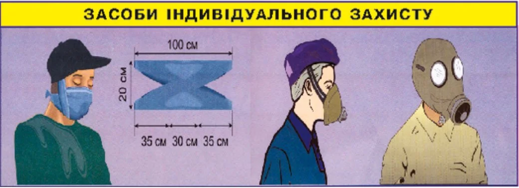 1. Швидко одягніть респіратор або ватно-марлеву пов'язку, при їх відсутності – прикрийте органи дихання рушником, хусткою чи шарфом.