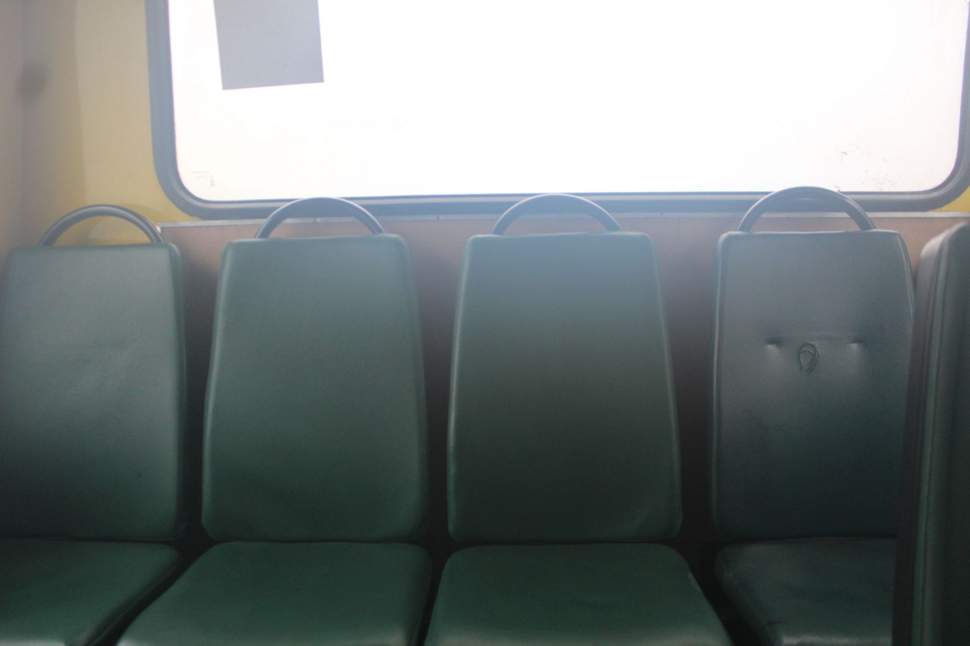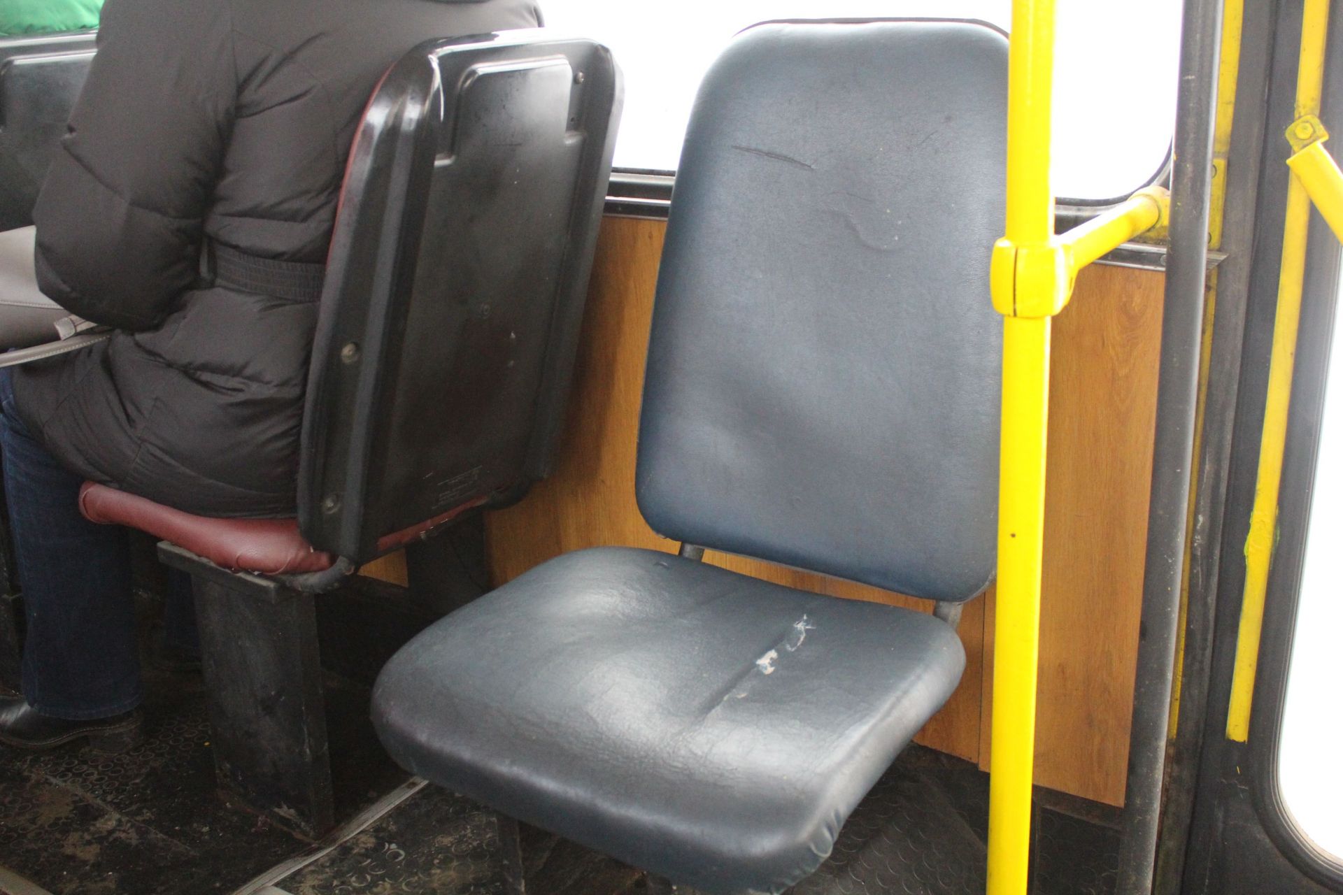 Обшивка на деяких сидіннях вже подерта, видно пожовклий поролон. Вона вже стара. Фарба на поручнях в багатьох місцях вже стерта.