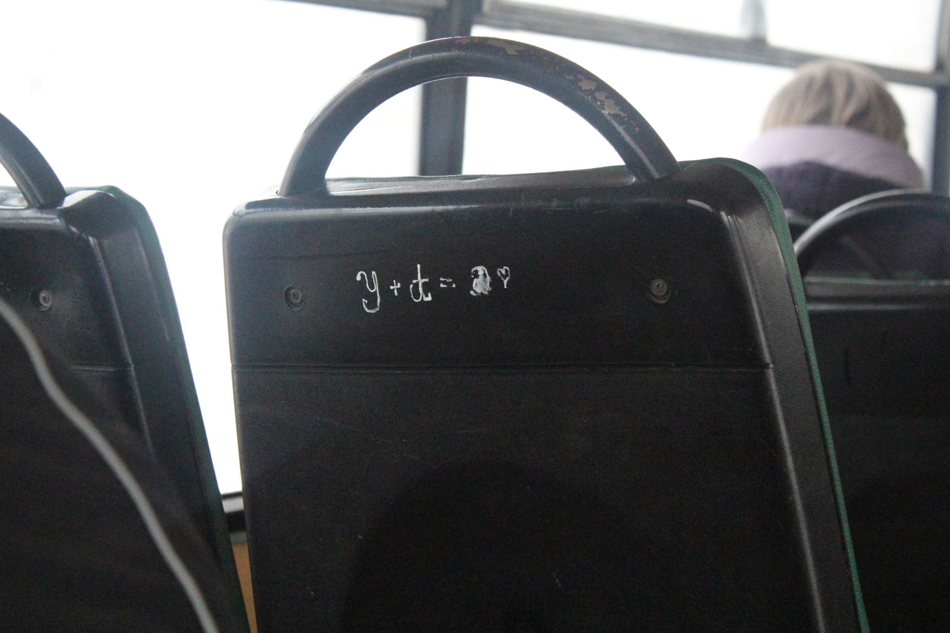 Далі ми пересіли на маршрутку №3. В ній також немає реклами. Сидіння вже старі. На спинках деяких сидінь написи коректором.