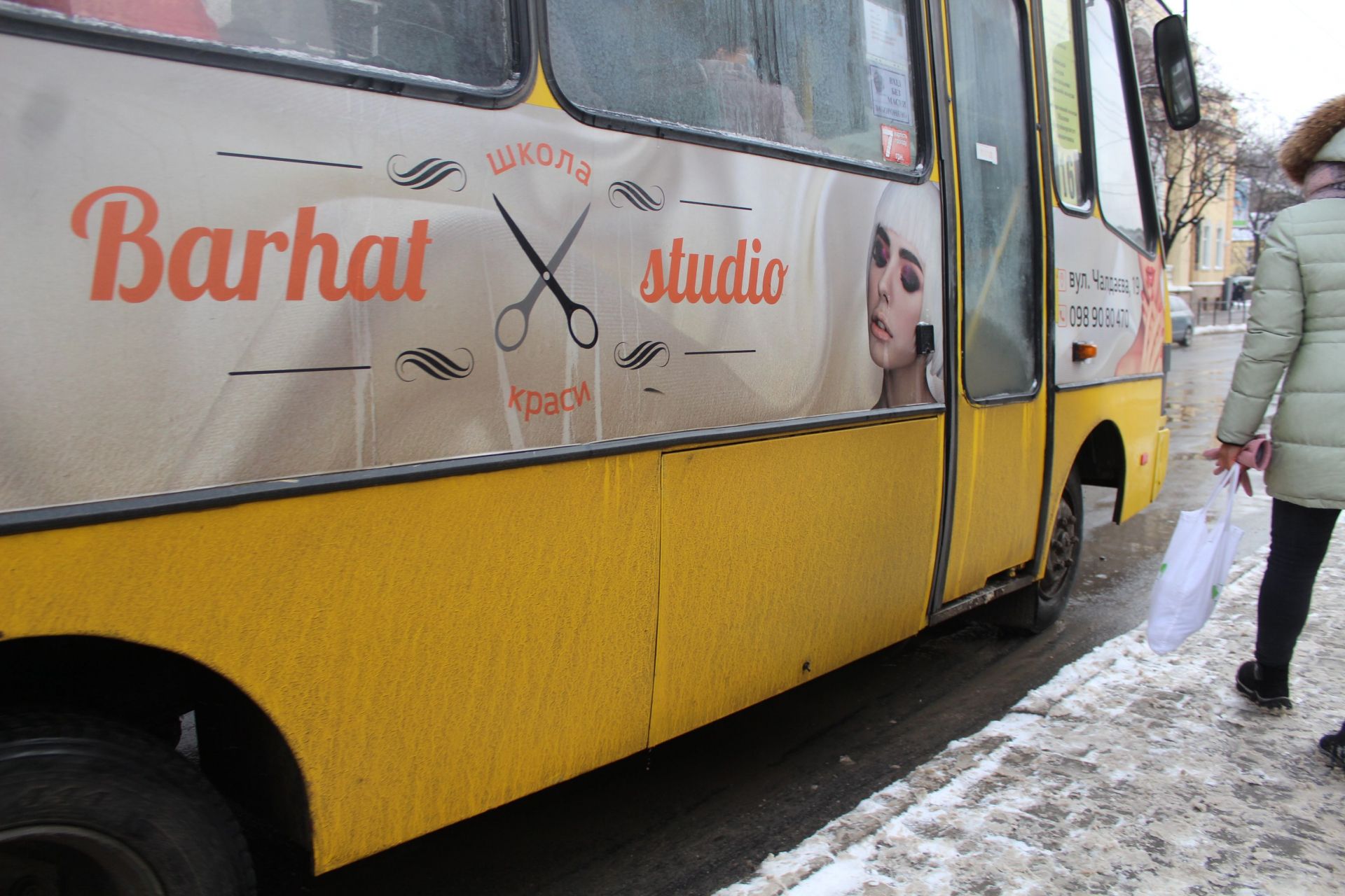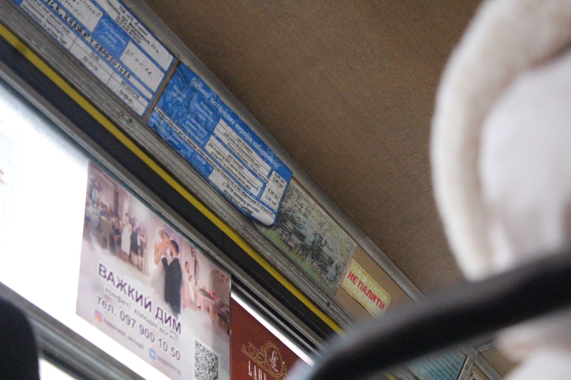 Перше, що кидається в очі – численна реклама, якою обліплена маршрутка як зовні, так і всередині.
