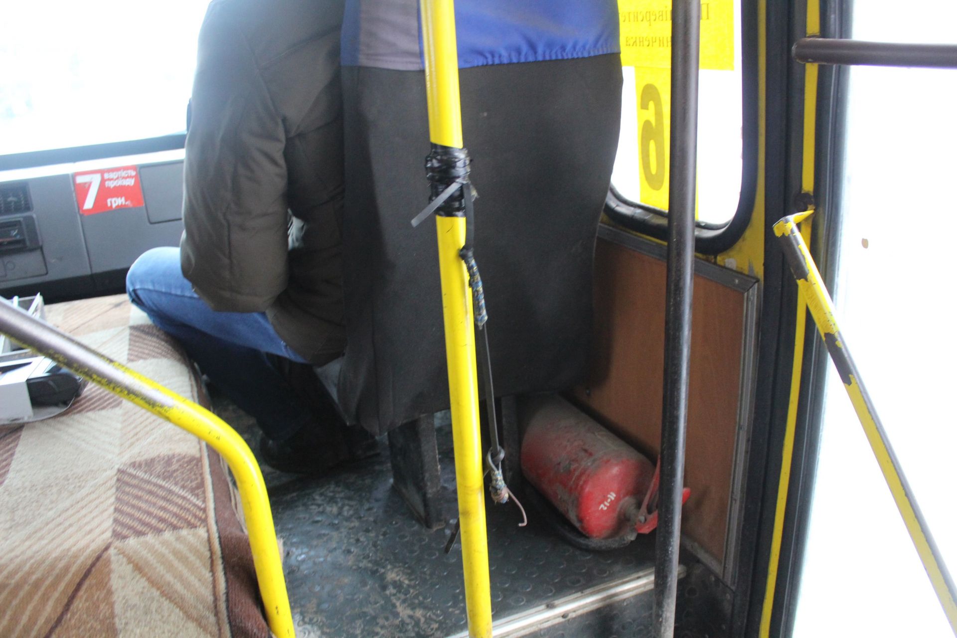 Під сидінням біля водія ми побачили вогнегасник, а на поручні біля передніх дверей незвичне пристосування – гумовий джут з гачком. Можливо він потрібен для того, щоб «перекрити» прохід на переднє сидіння.
