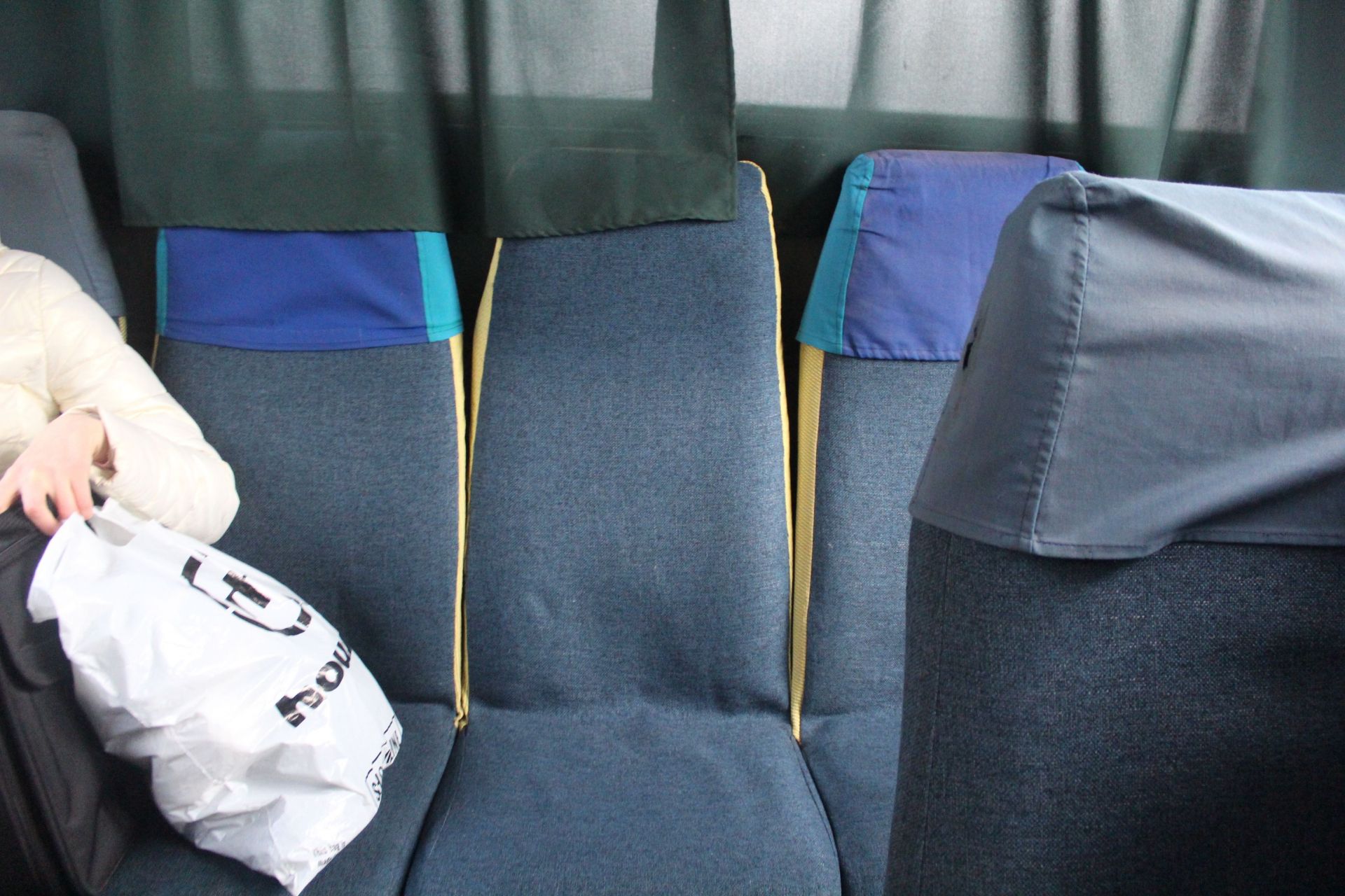 Далі ми сіли на маршрутку №18. Всередині сидіння обшиті тканиною. В деяких місцях помітні затертості, але вони відносно чисті та м’які. Їхати можна з комфортом.