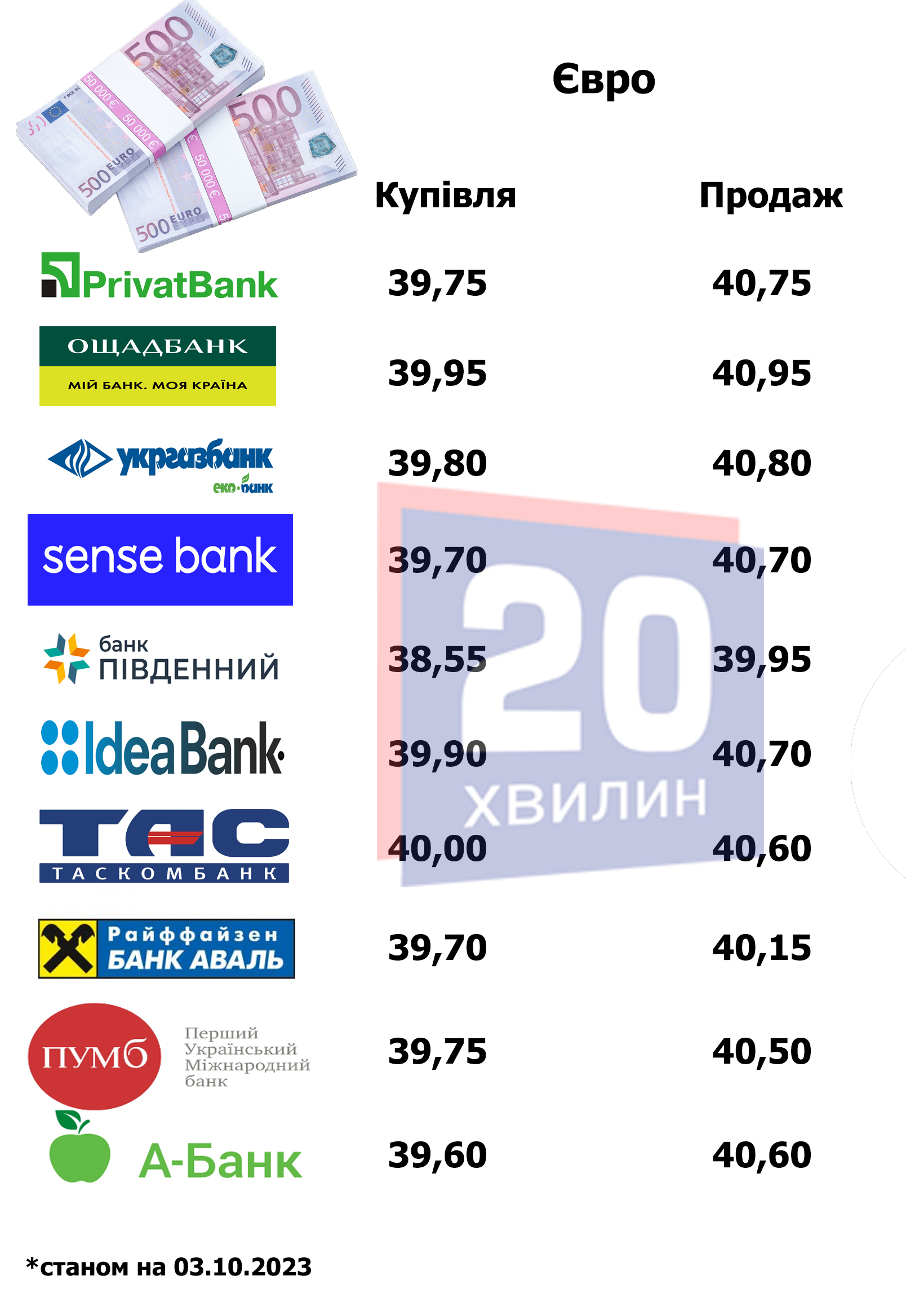 Курс євро – від 39,60 до 40,30 за купівлю та від 40,50 до 41,00 за продаж.
