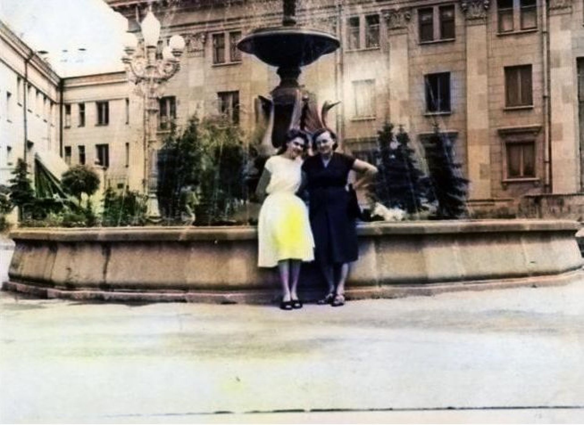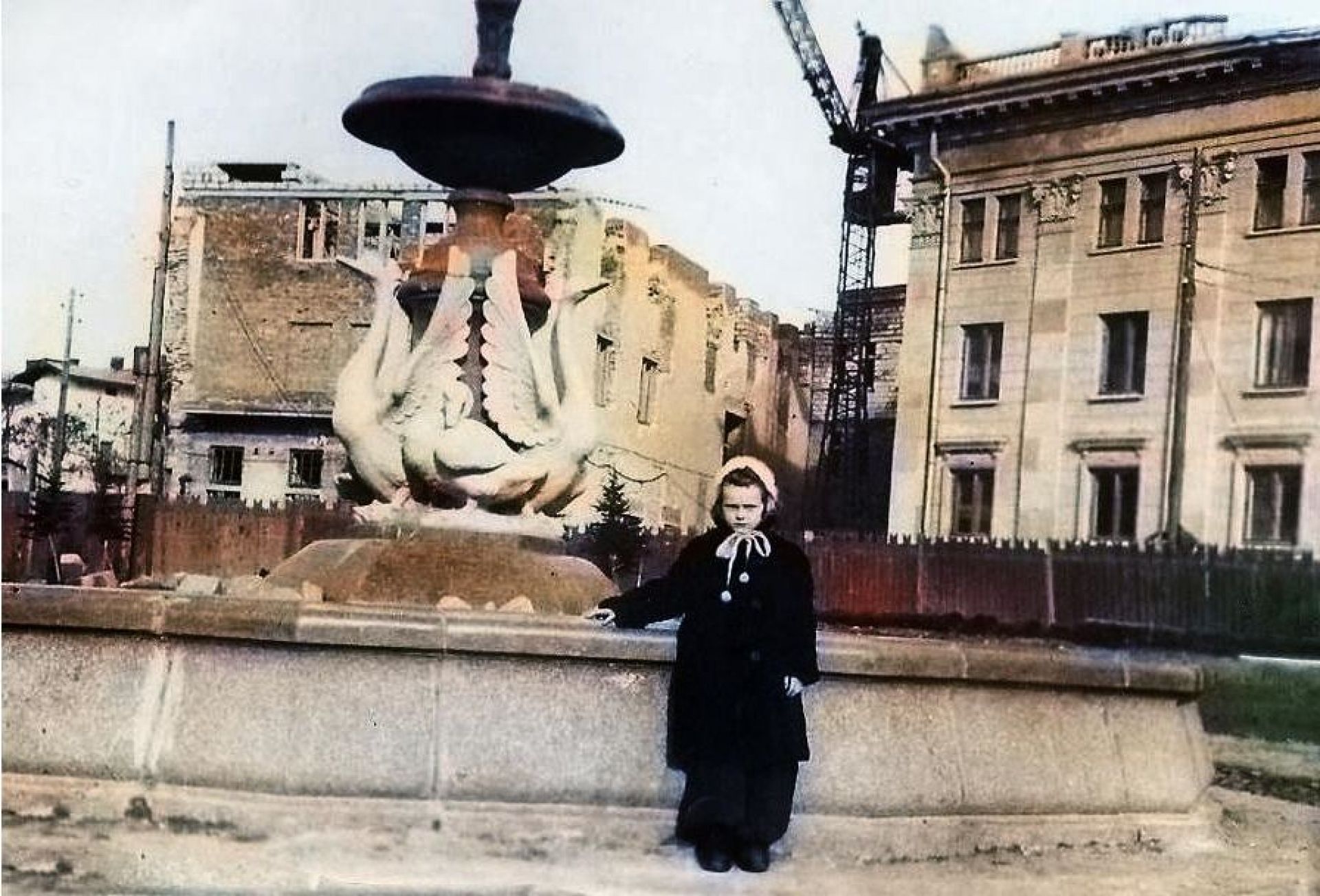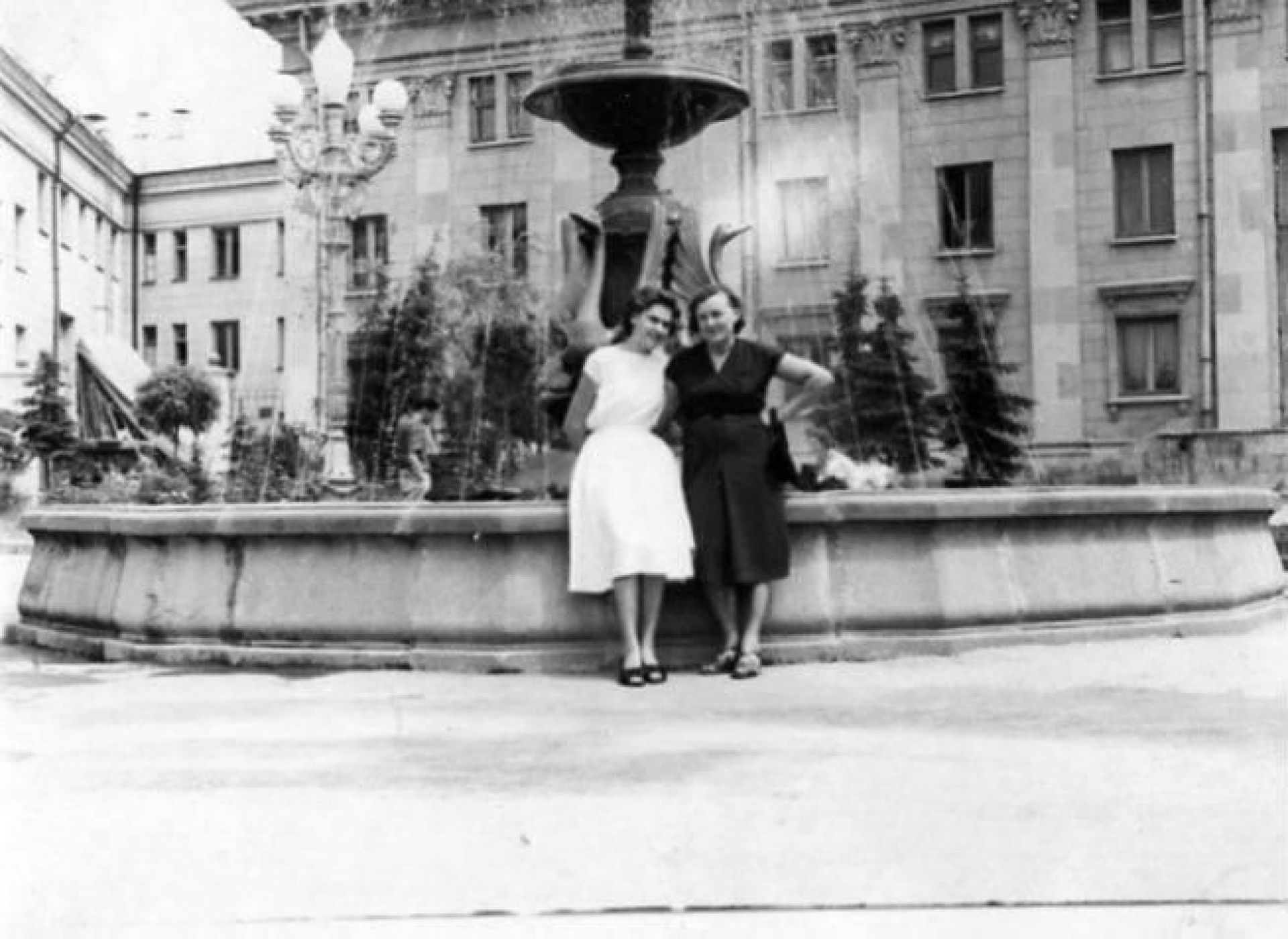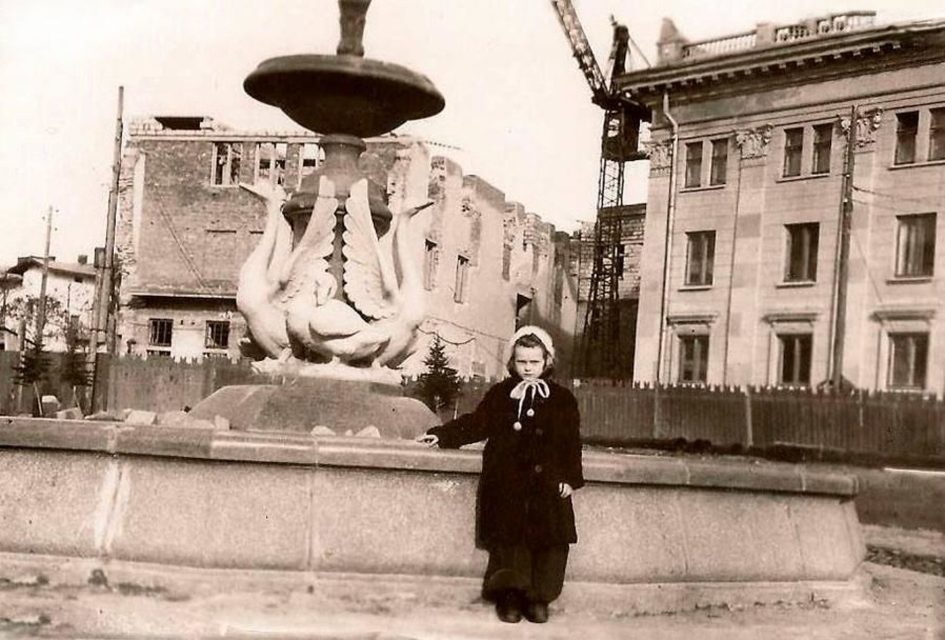 Це фото «лебедів», 1955–1956 років. На задньому плані добре видно добудову комплексу драмтеатру.