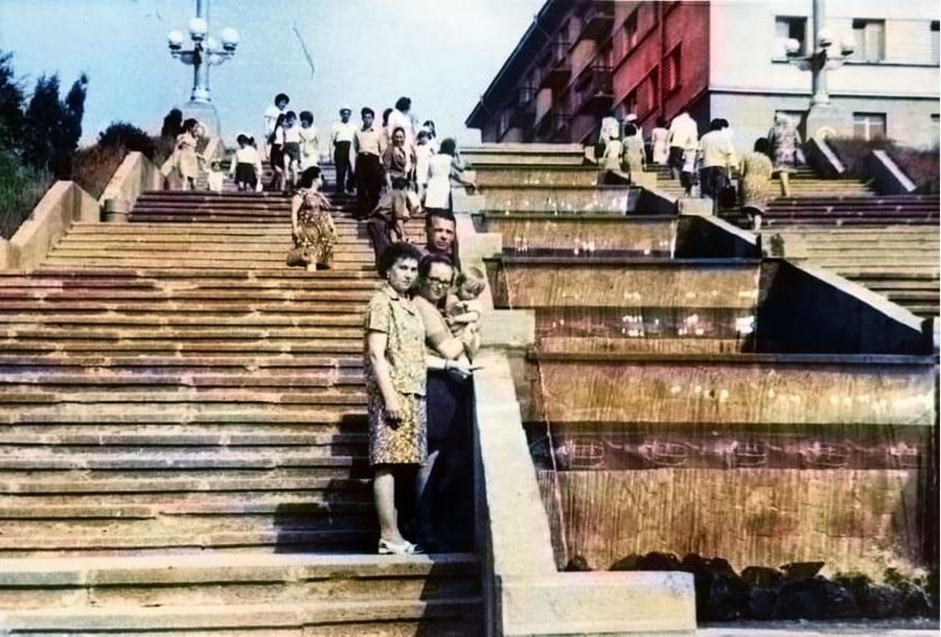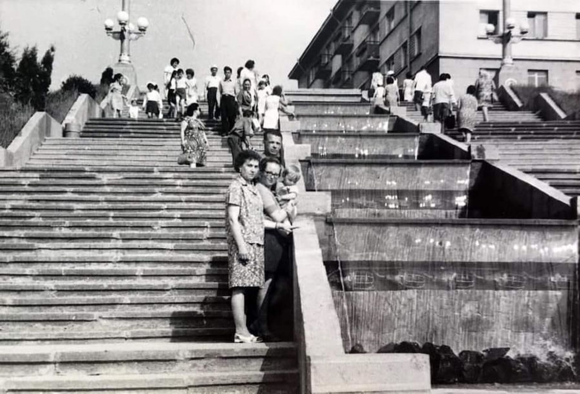А це – фонтан «Сльози Гронського». Фото 1972 року. Сходи розташовані біля Тернопільського замку. Їх відреставрували. Фонтан має нову підсвітку.