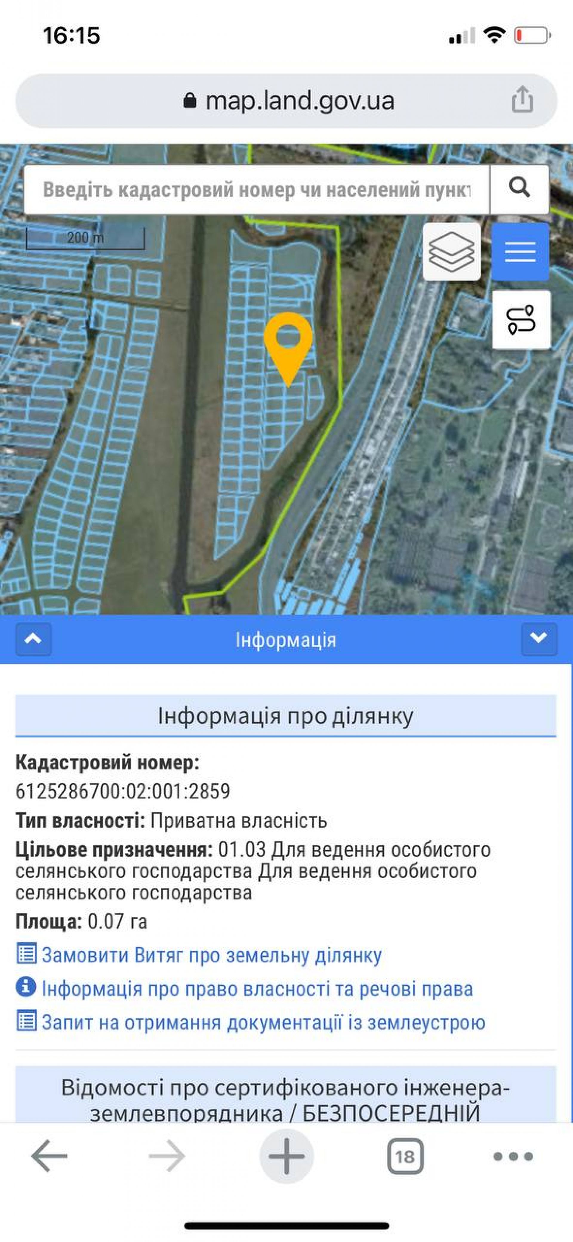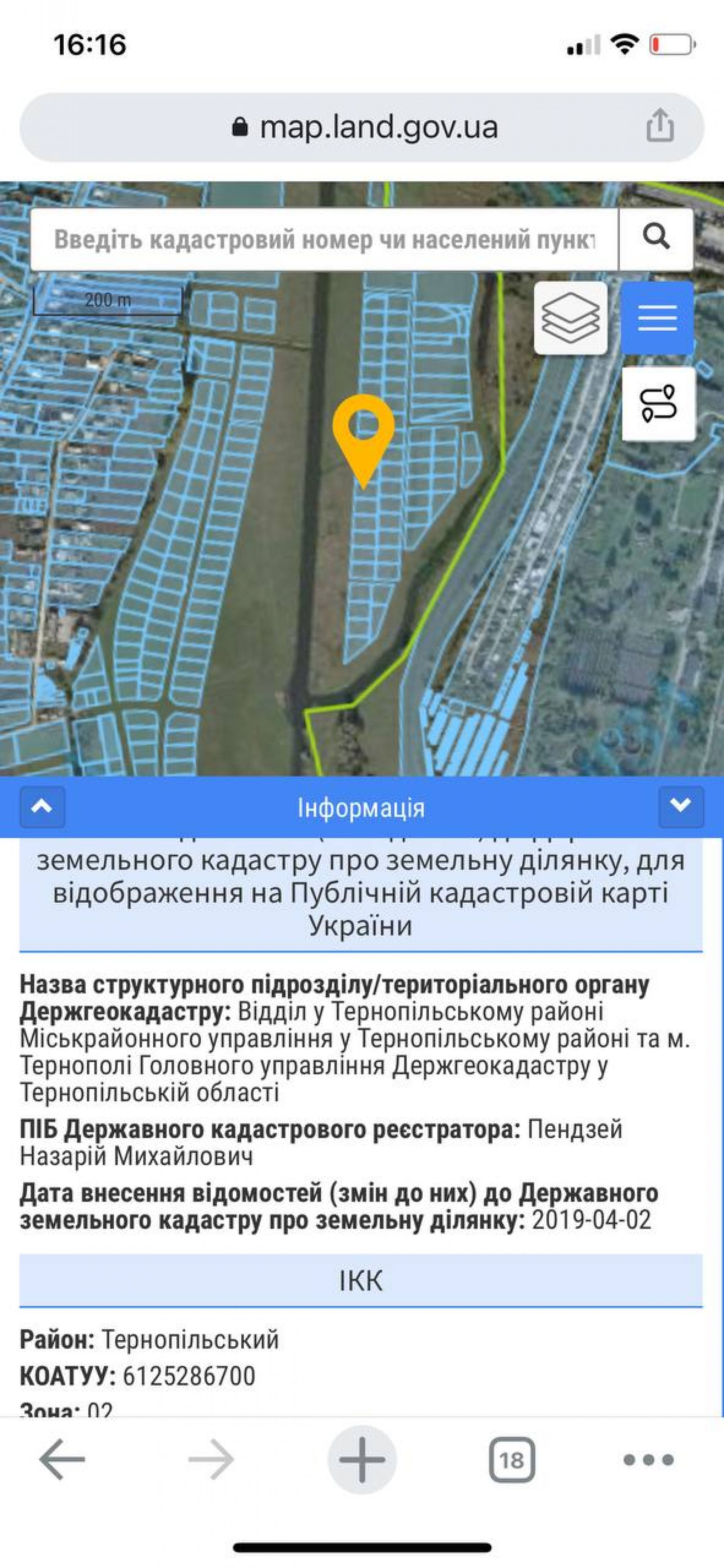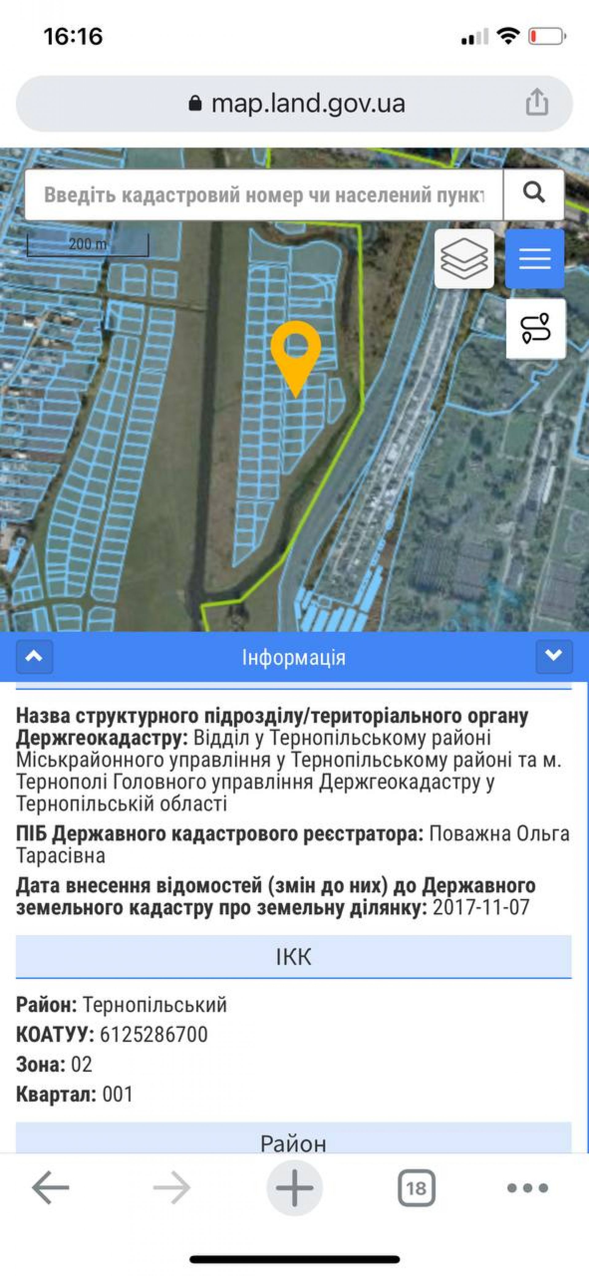 «20 хвилин» також перевірили призначення цих земельних ділянок у Державному земельному кадастрі – на Публічній кадастровій карті. !!!!!Як виявилось, не всі з 57 – комерційного призначення. Чимало з них є і для ведення особистого селянського господарства. Та й роки реєстрації далеко не всі 2009-го. Свідомо чи несвідомо заявники вводили журналістів в оману та хто і як отримав ці землі – питання інше, можливо, буде предметом розслідування в одному з наступних матеріалів. А поки на підтвердження наших слів – скріни інформації про деякі ділянки з кадастрової карти.