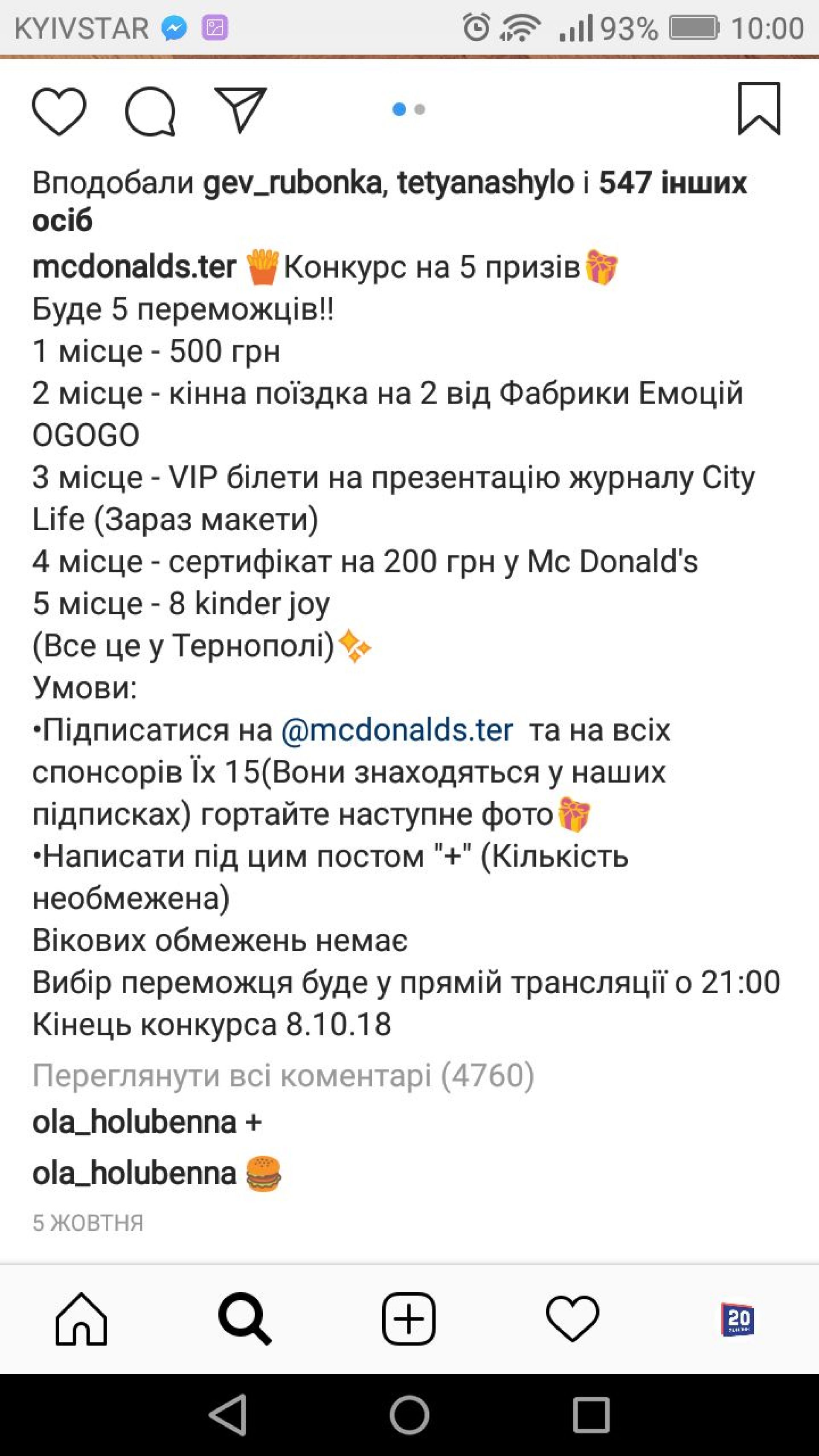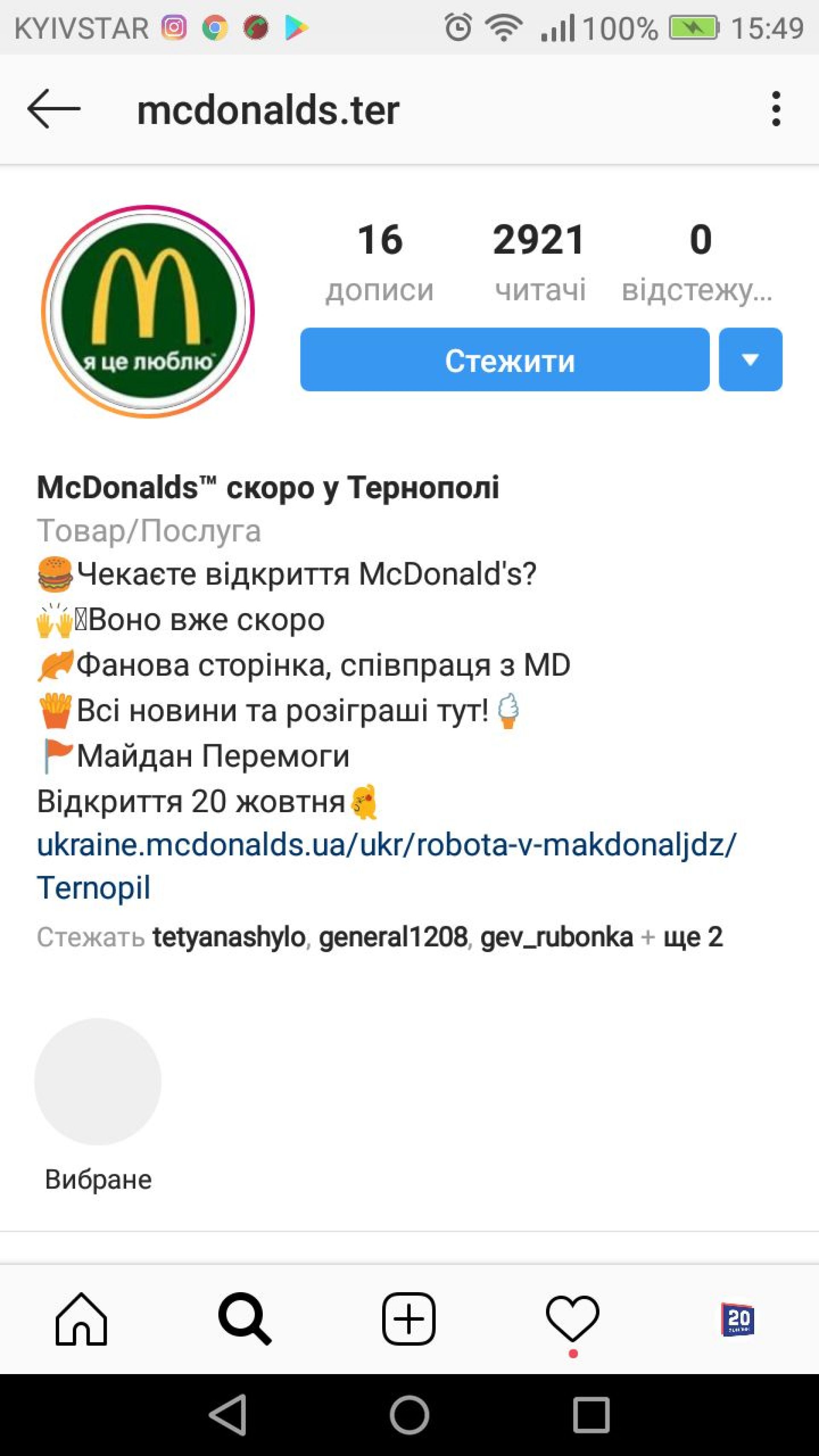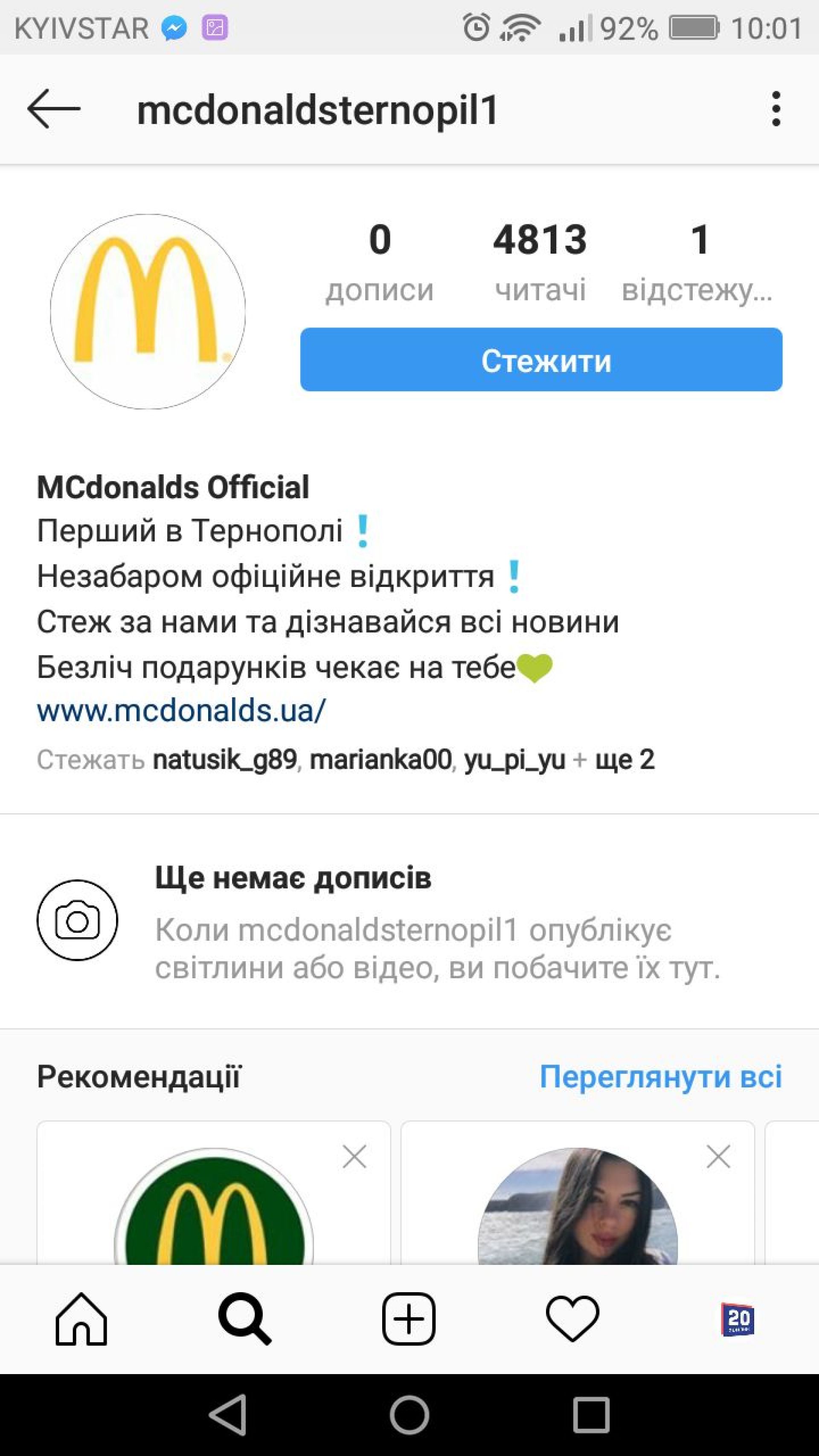 - Я активний користувач інстаграму і нещодавно знайшла офіційну сторінку тернопільського McDonald's, потім ще одну і ще одну. - каже тернополянка Наталія. - Ціуаво яка з них справжня. На одній зі сторінок є розіграш , але чомусь я сумніваюсь, що він реальний.