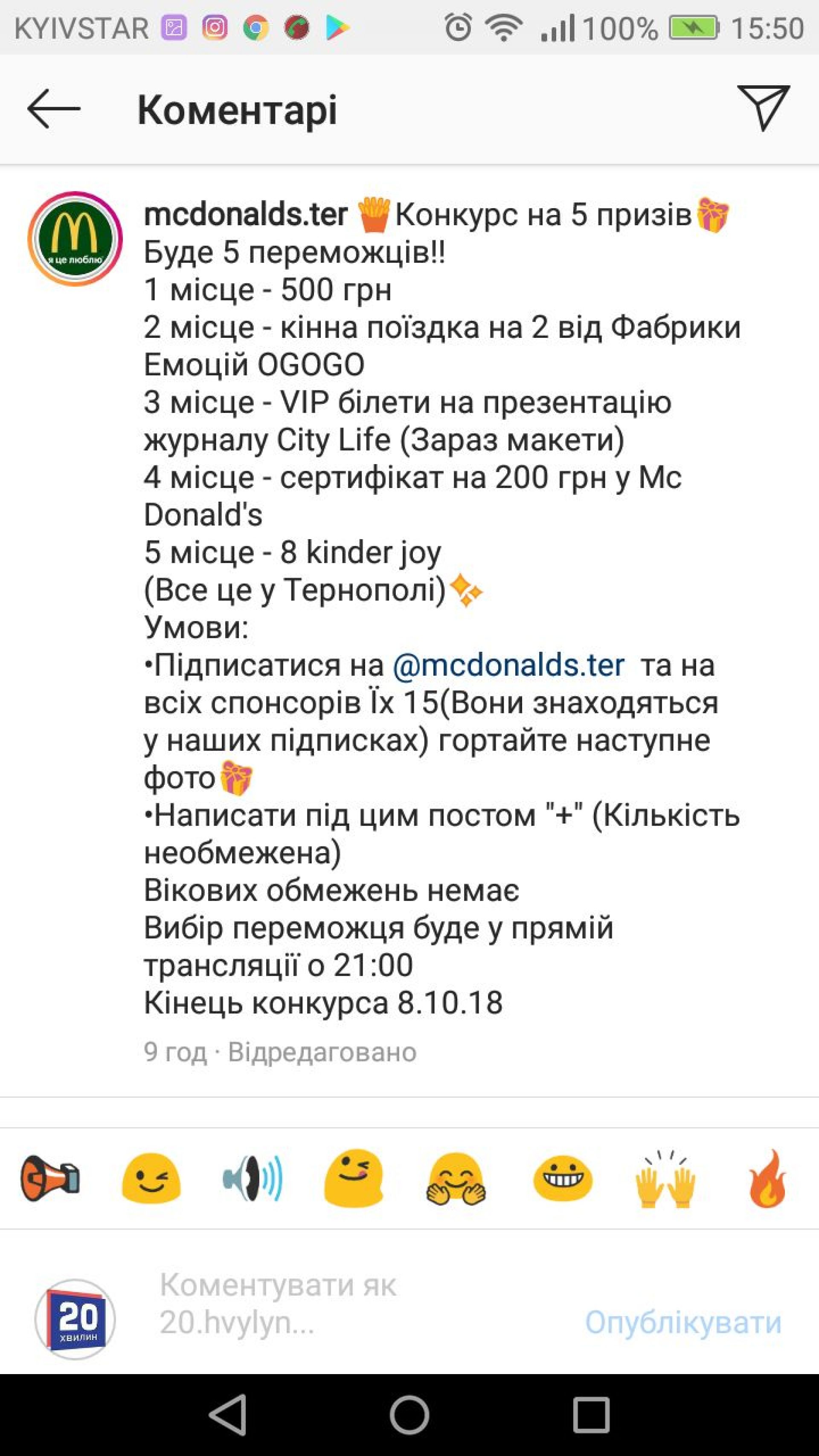 І справді, на сторінці "mc_donalds_ternopil_" є розіграш з такими умовами: першим 150 користувачам, які виконають умови подарують "Біг мак меню". Наступним 300 знижку на 25% на меню на суму до 350 гривень. Наступним 200 знижку на 15% на меню на суму 350 гривень. На наступних 500 чекають приємні знижки,акції і подарунки.