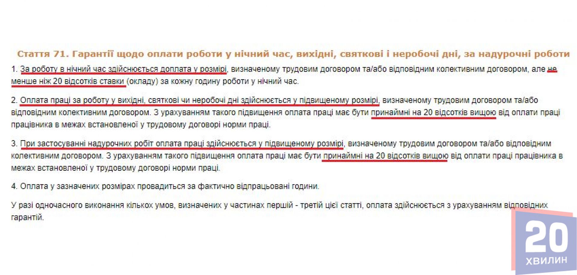 Законопроєктом скасовують державну гарантію мінімальної заробітної плати на рівні прожиткового мінімуму. Скасовано обмеження надурочних робіт за індивідуальним договором. Надурочні роботи наразі оплачуються у подвійному розмірі, а за новим законом – від 20%, тобто тепер роботодавці матимуть змогу платити за перепрацювання значно менше. Це стосується оплати за роботу і у святкові та неробочі дні.