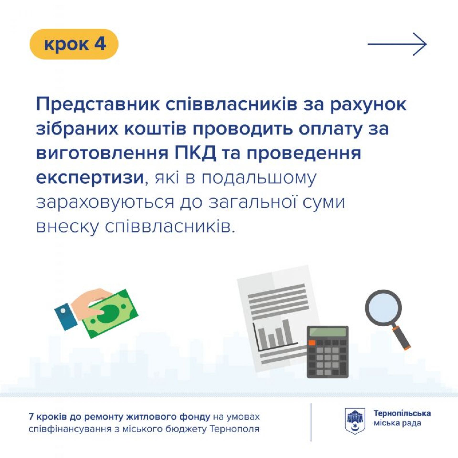 Крок 4. Представник співвласників за рахунок зібраних коштів проводить оплату за виготовлення ПКД та проведення експертизи, які в подальшому зараховуються до загальної суми внеску співвласників.
