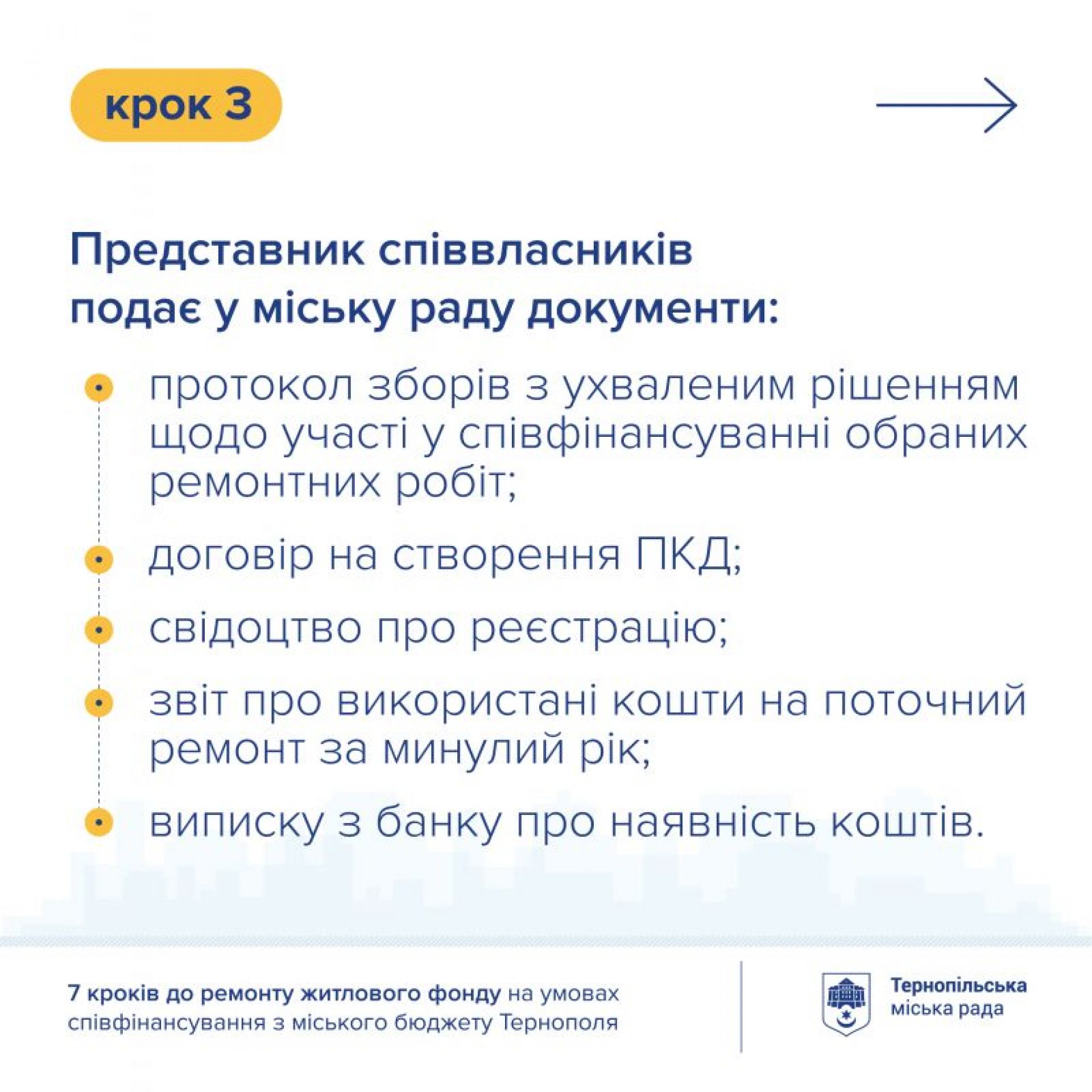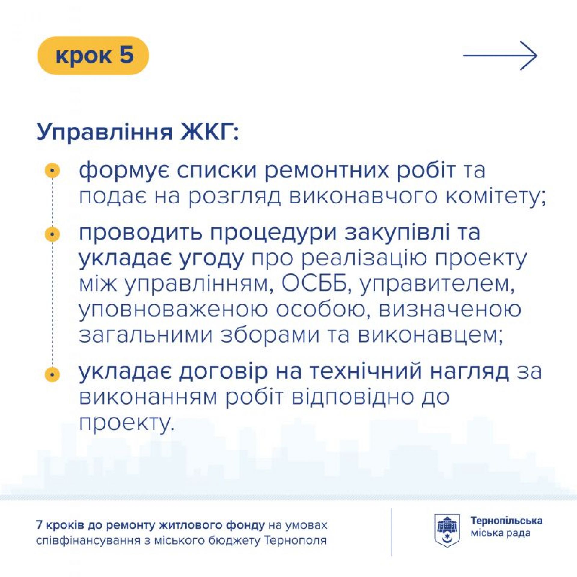 — Роботи з виконання ремонту житлового фонду та їх оплата здійснюватиметься на умовах співфінансування за рахунок видатків спеціального фонду місцевого бюджету, — пояснила Мар’яна Зварич. — Стати учасником Програми можуть як ОСББ, так і управителі будинків (ЖЕКи). Дія Порядку проведення ремонтів поширюється на всі багатоквартирні будинки Тернопільської громади, які експлуатуються понад 10 років.