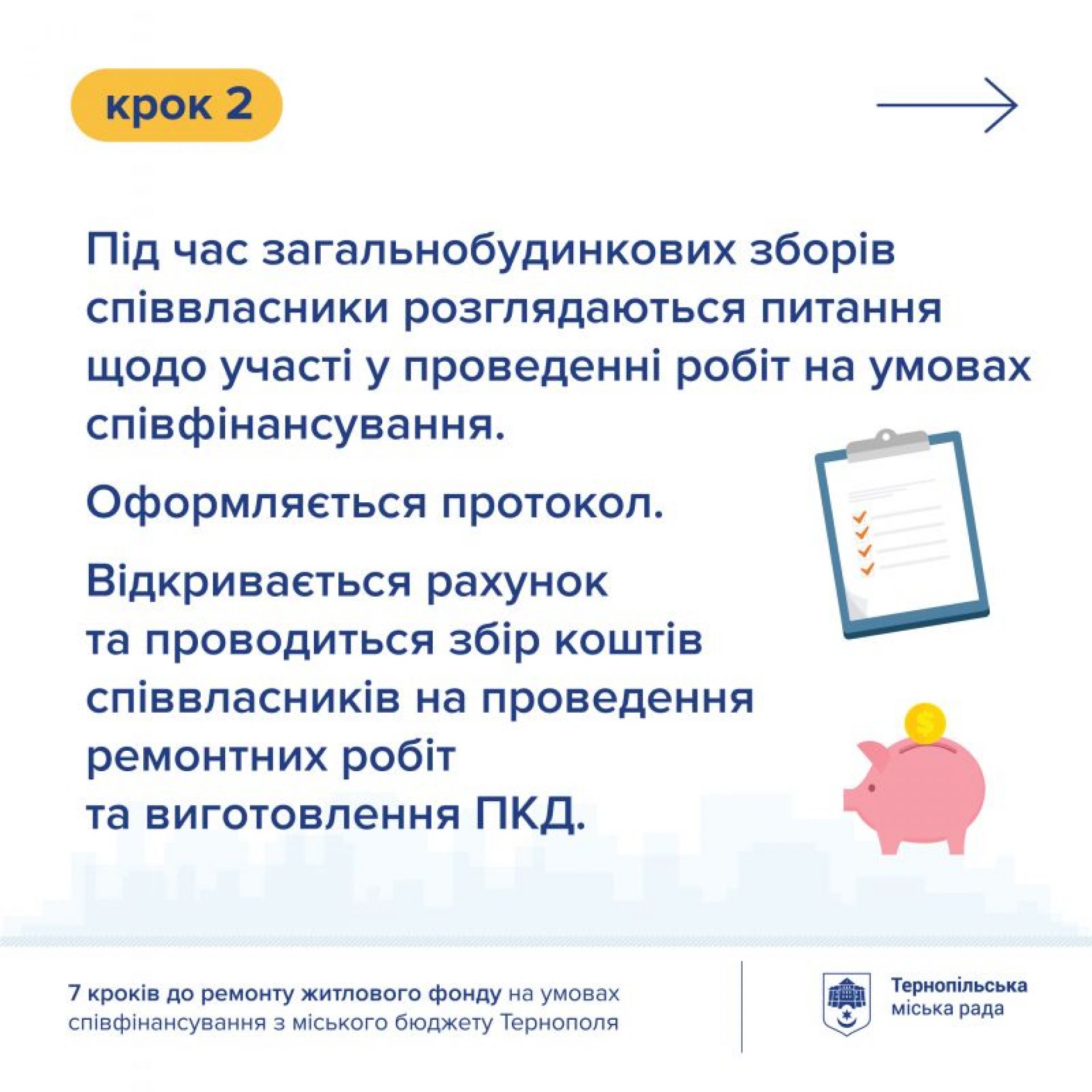 Крок 2. Під час загальнобудинкових зборів співвласники розглядаються питання щодо участі у проведенні робіт на умовах співфінансування. Оформляється протокол. Відкривається рахунок та проводиться збір коштів співвласників на проведення ремонтних робіт та виготовлення ПКД.