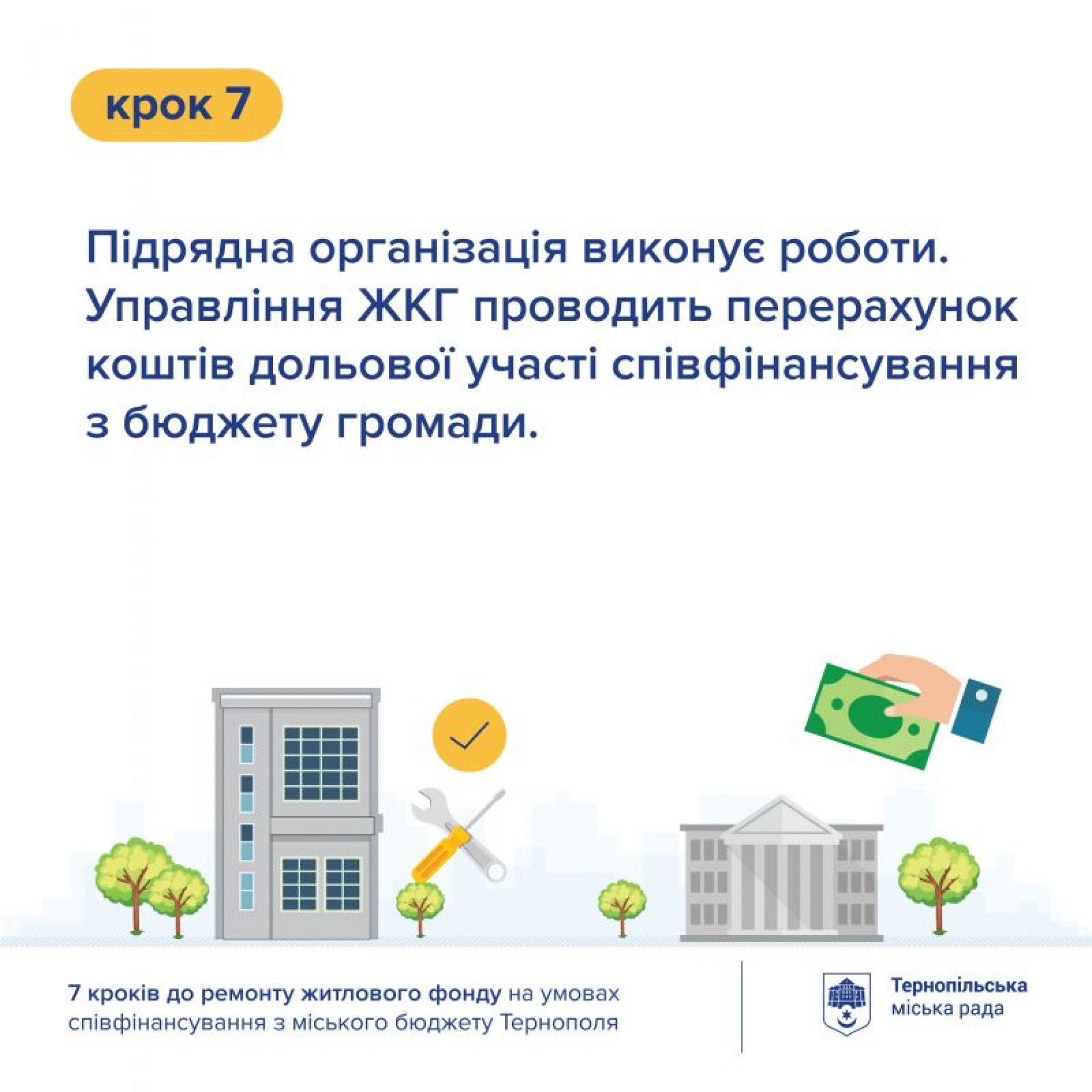 Крок 7. Підрядна організація виконує роботи. Управління ЖКГ проводить перерахунок коштів дольової участі співфінансування з бюджету громади.