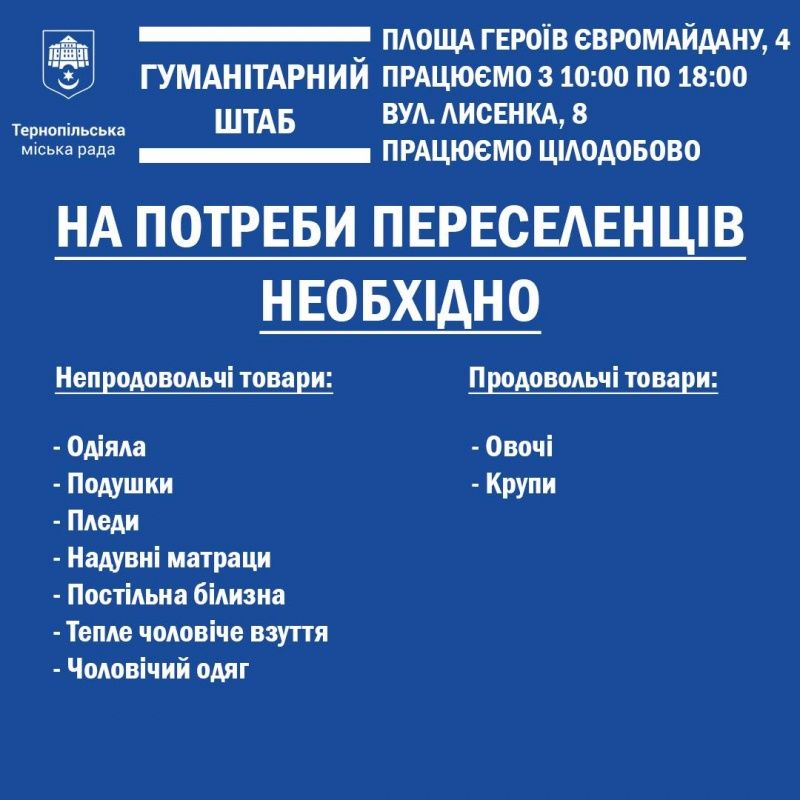 Міський Гуманітарний штаб потребує речей для внутрішньо переміщених осіб: ковдри, подушки, пледи, надувні матраци, постільна білизна, тепле чоловіче взуття та чоловічий одяг. Також є гостра потреба у деяких продуктах харчування, а саме овочах та крупах.