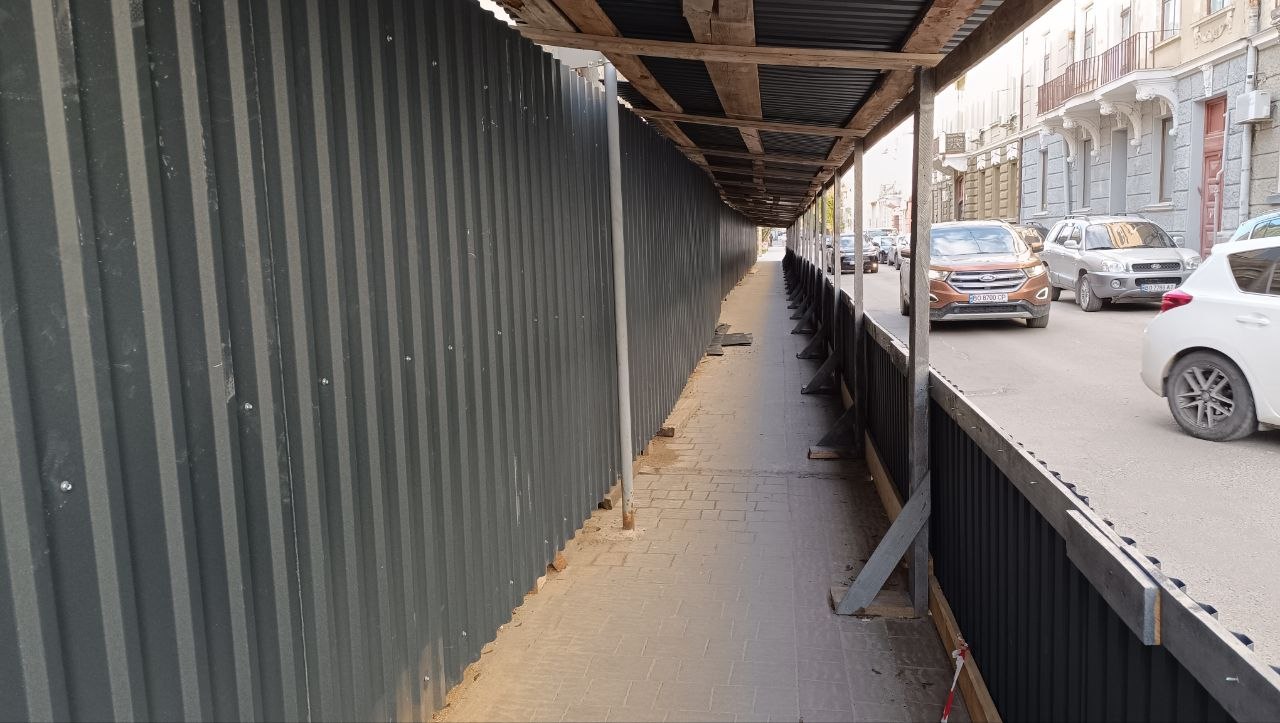Металевий паркан і накритий прохід біля будинку на вулиці Франка, 3 викликали питання у перехожих — конструкція виглядає як підготовка до будівельних робіт. Утім, у міській раді запевняють: жодних робіт тут не проводять, а огородження встановили з міркувань безпеки.