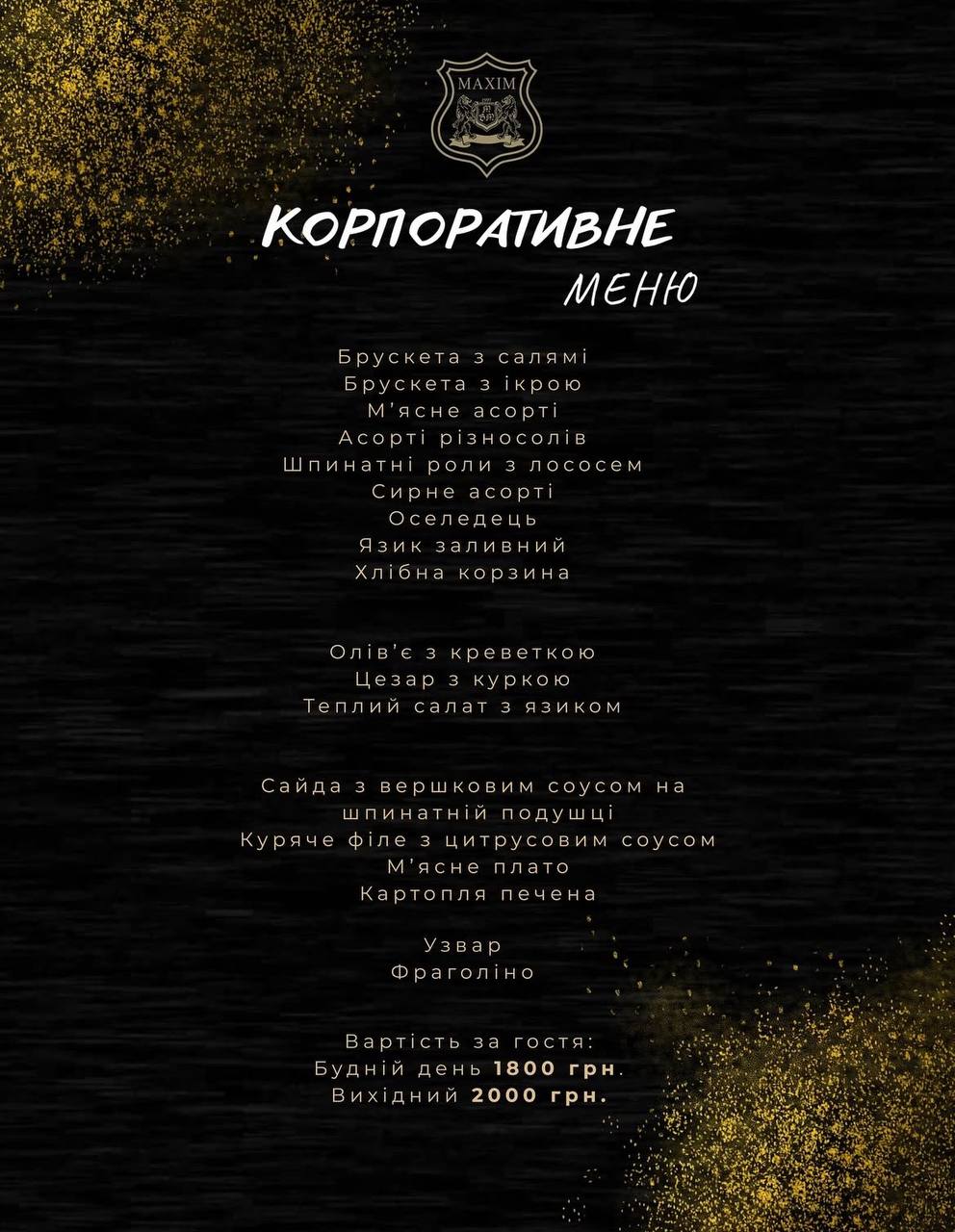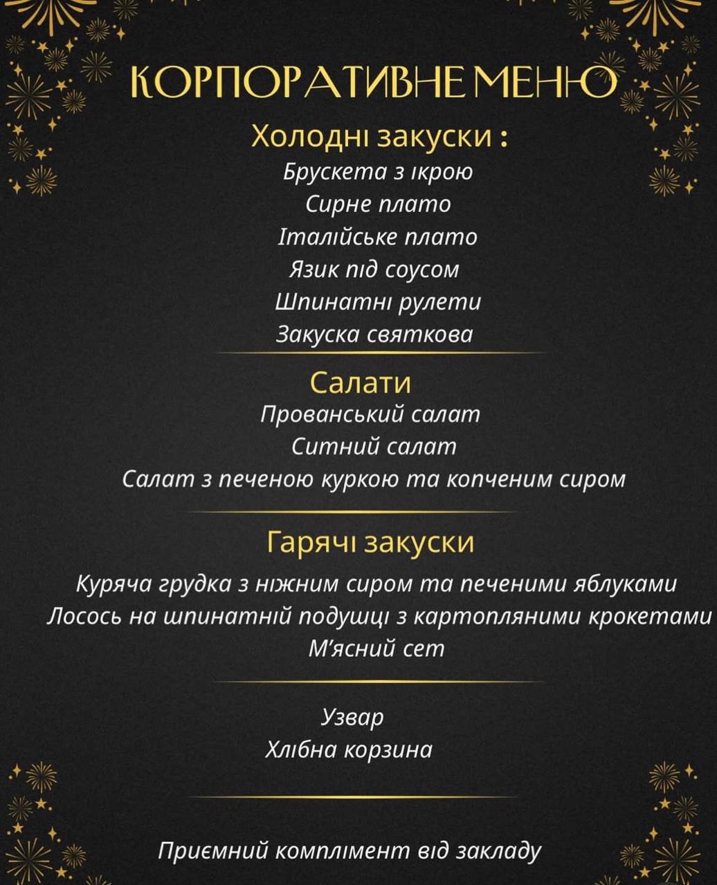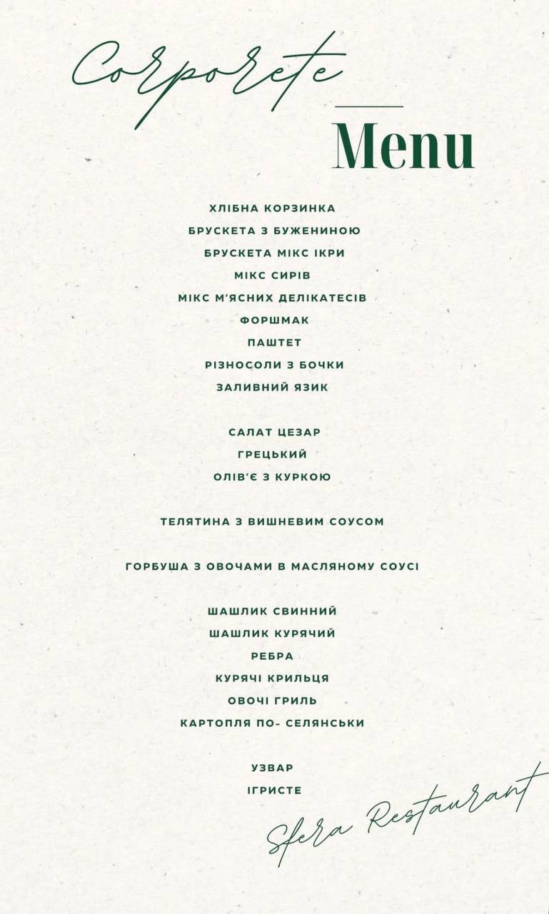 – У корпоративному меню є кілька видів брускет, асорті різносолів та м’яса, олів’є з криветкою, цезор з куркою, теплий салат з язиком, сайда з вершковим соусом на шпинатній подушці, м’ясне плато та інше. А ось з напоїв – узвар та фраголіно, – пишуть на сторінці закладу.
