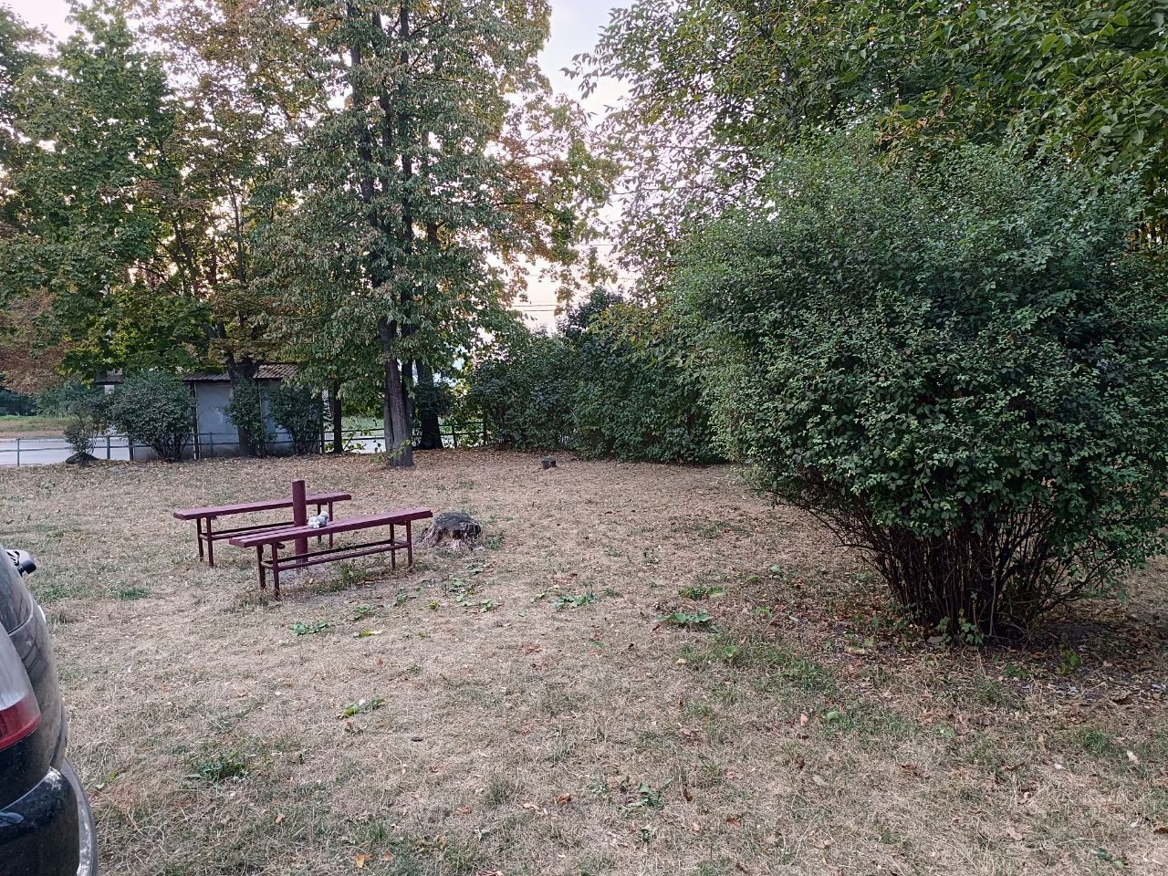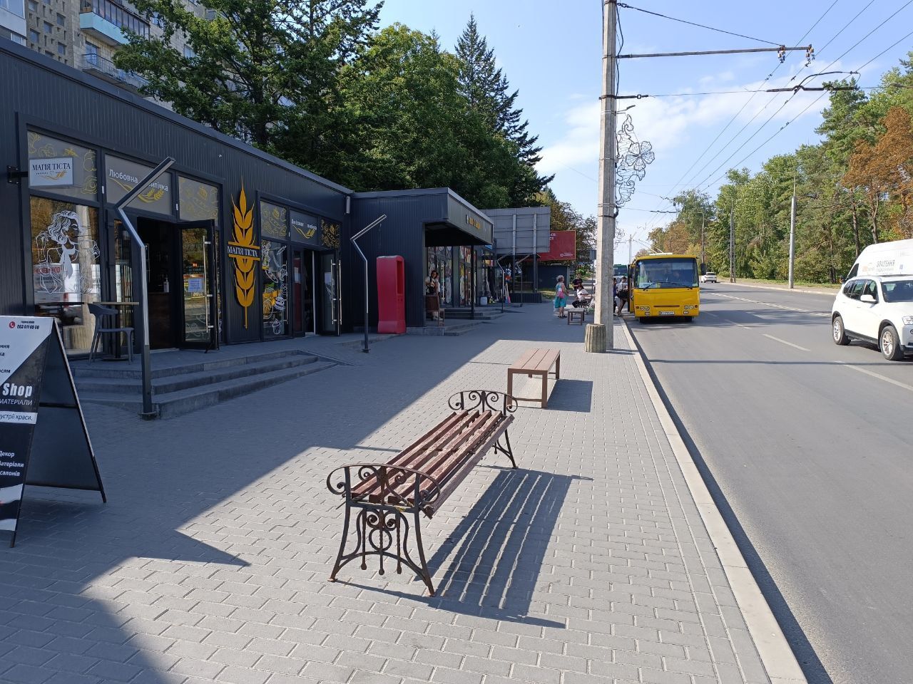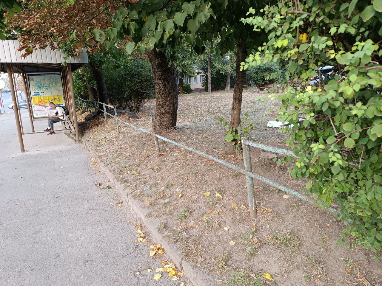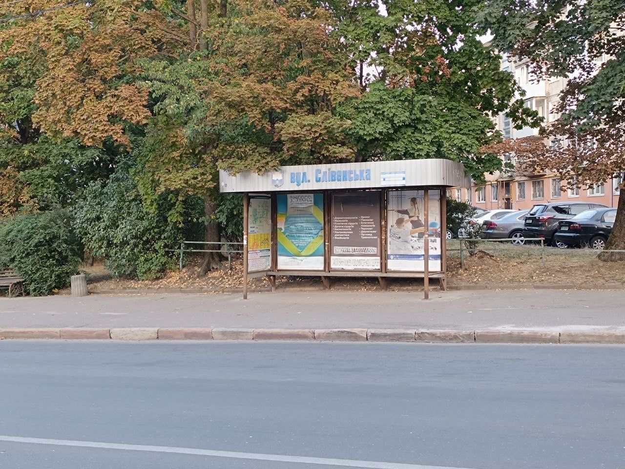 «20 хвилин» відвідали зупинку громадського транспорту «Вул. Слівенська» (до центру). Зараз там немає жодних будов, кіосків, МАФів чи іншого. Є невелика конструкція із навісом і лавкою для пасажирів, які очікують на транспорт. Огородження старе і подекуди поламане. За зупинкою розташована зелена зона із кількома деревами, дерев’яним столиком і лавками.