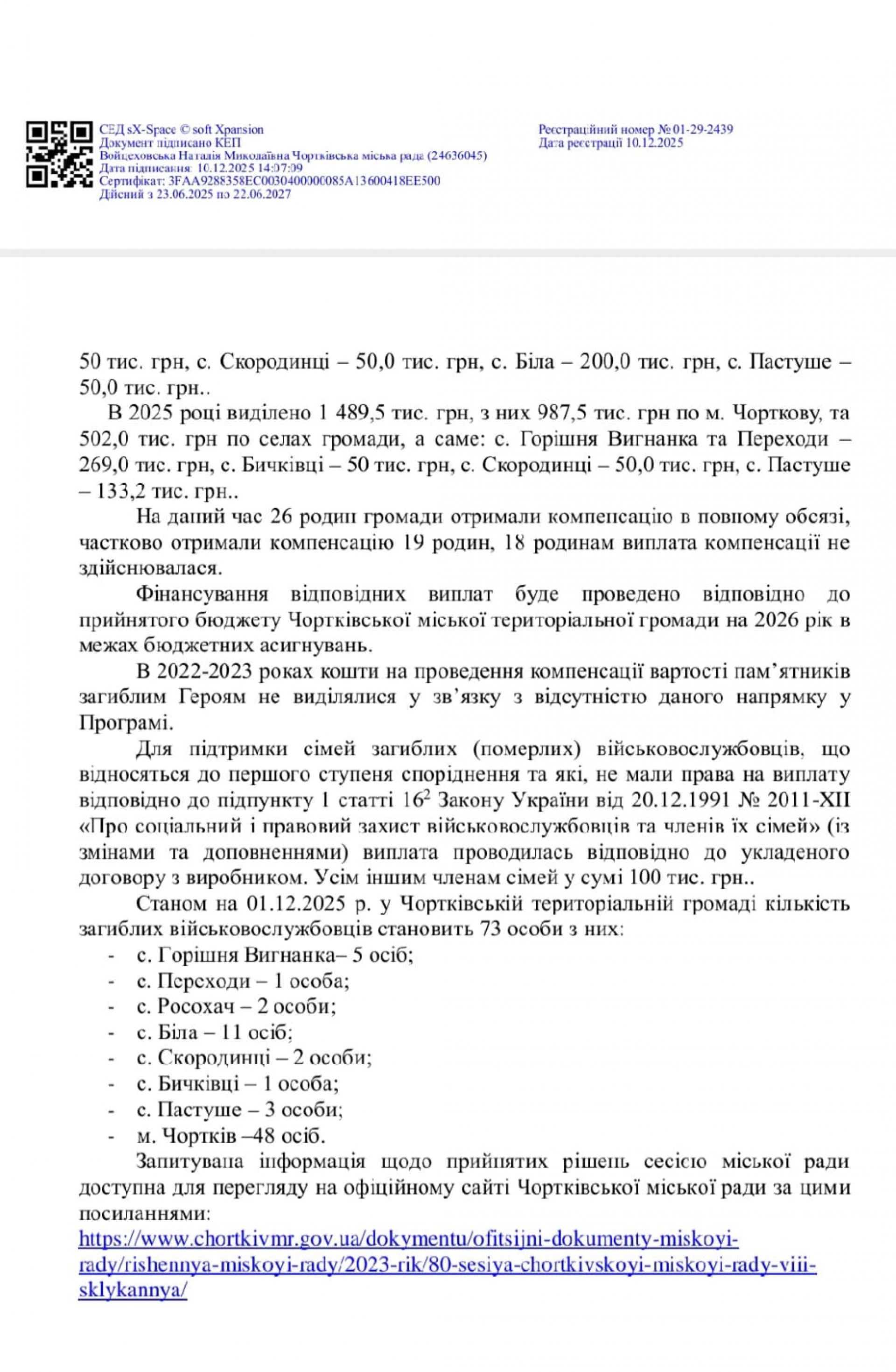 У відповіді перша заступниця міської ради Чорткова Наталія Войцеховська фактично підтвердила: компенсації почали виплачувати лише з 2024 року, а десятки родин досі не отримали коштів.