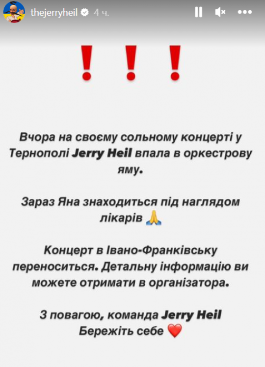– Зараз Яна знаходиться під наглядом лікарів. Концерт в Івано-Франківську переноситься. Детальну інформацію ви можете отримати в організатора. З повагою, команда Jerry Heil. Бережіть себе! – звернулись до шанувальників «зірки» представники Jerry Heil.