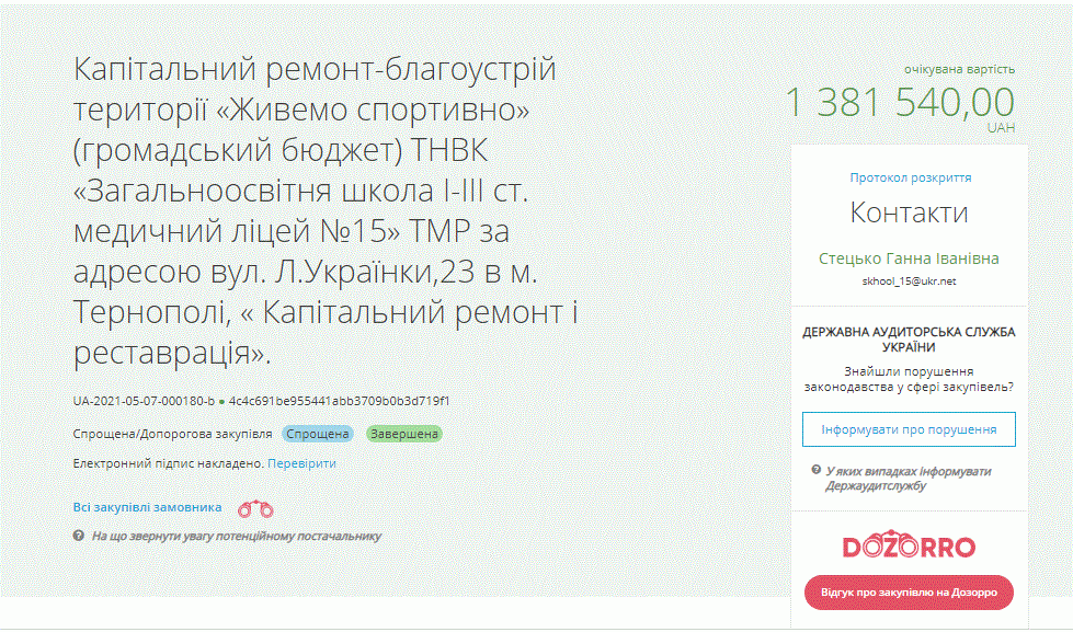 Проєкт створення сучасного спортивного майданчика на території ТНВК №15 тернополяни зареєстрували 28 вересня 2020-го року. Вартість, вказана в проєкті —1450000 гривень, термін реалізації — 2021 рік.