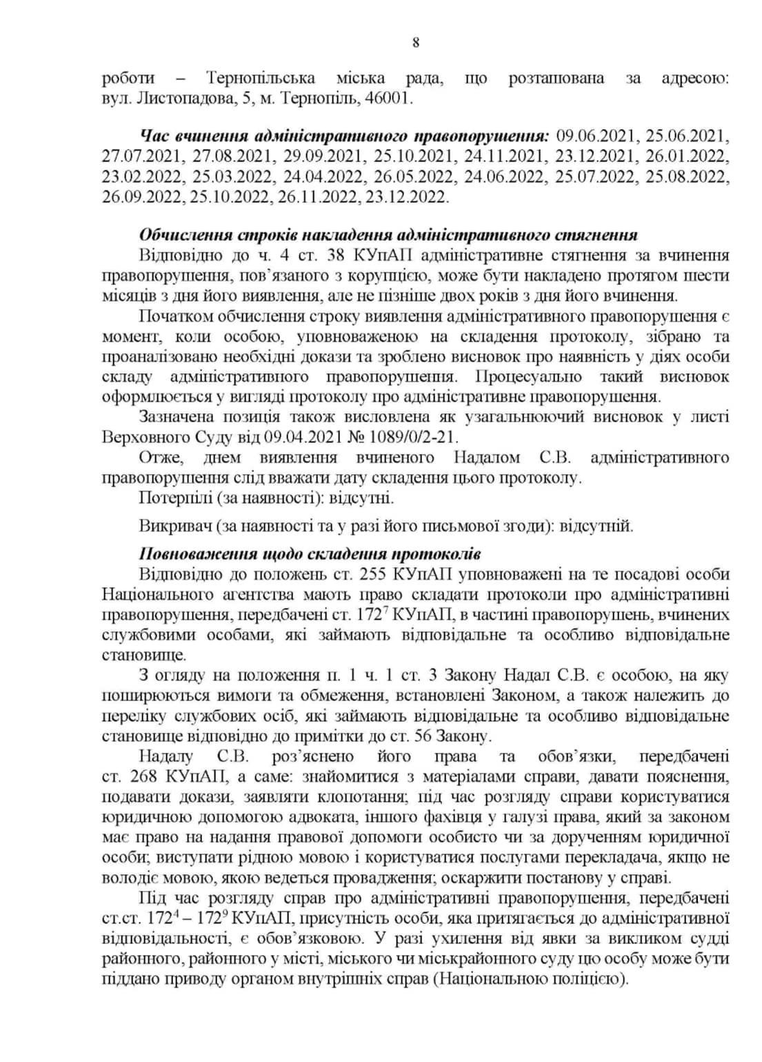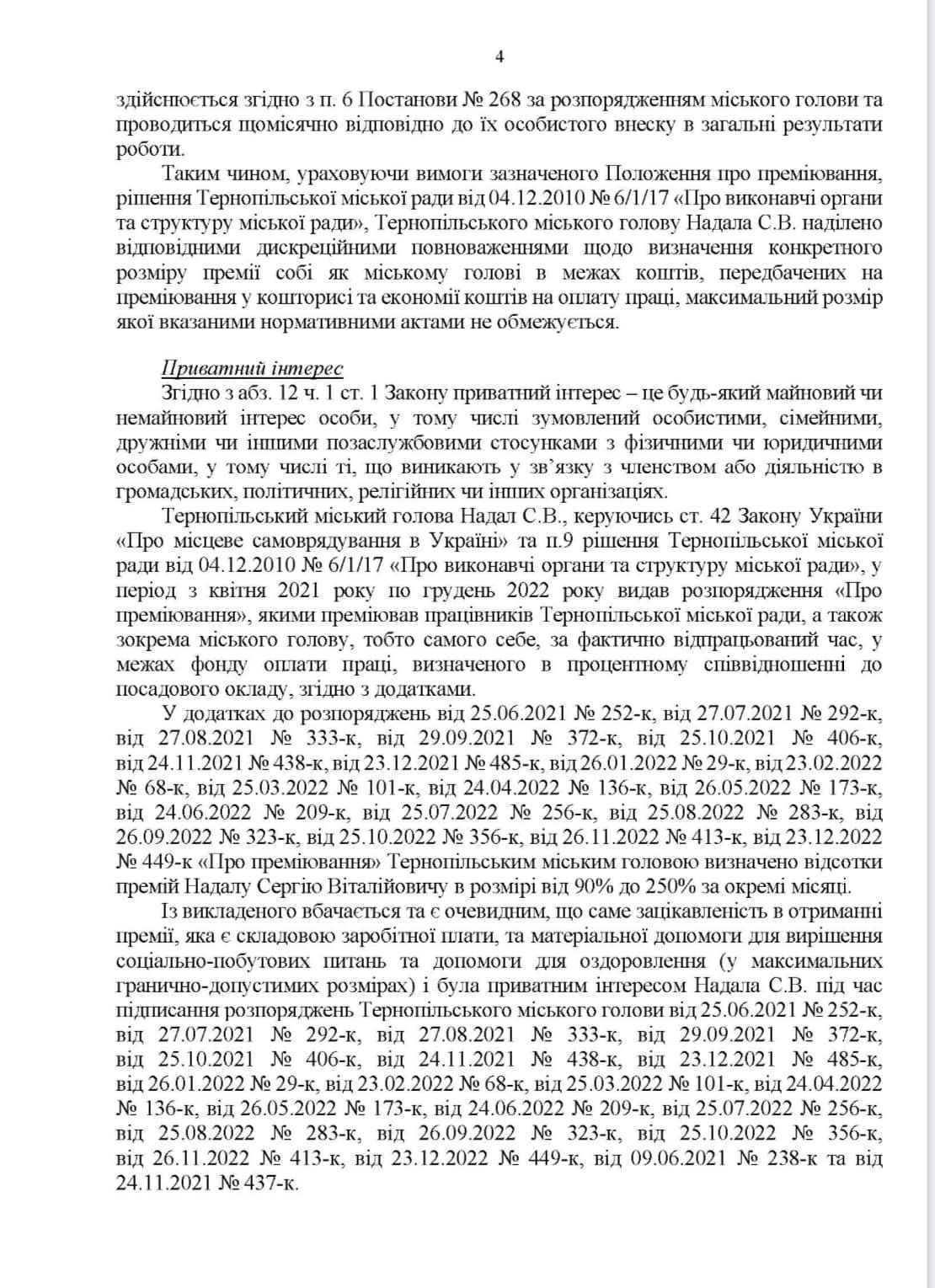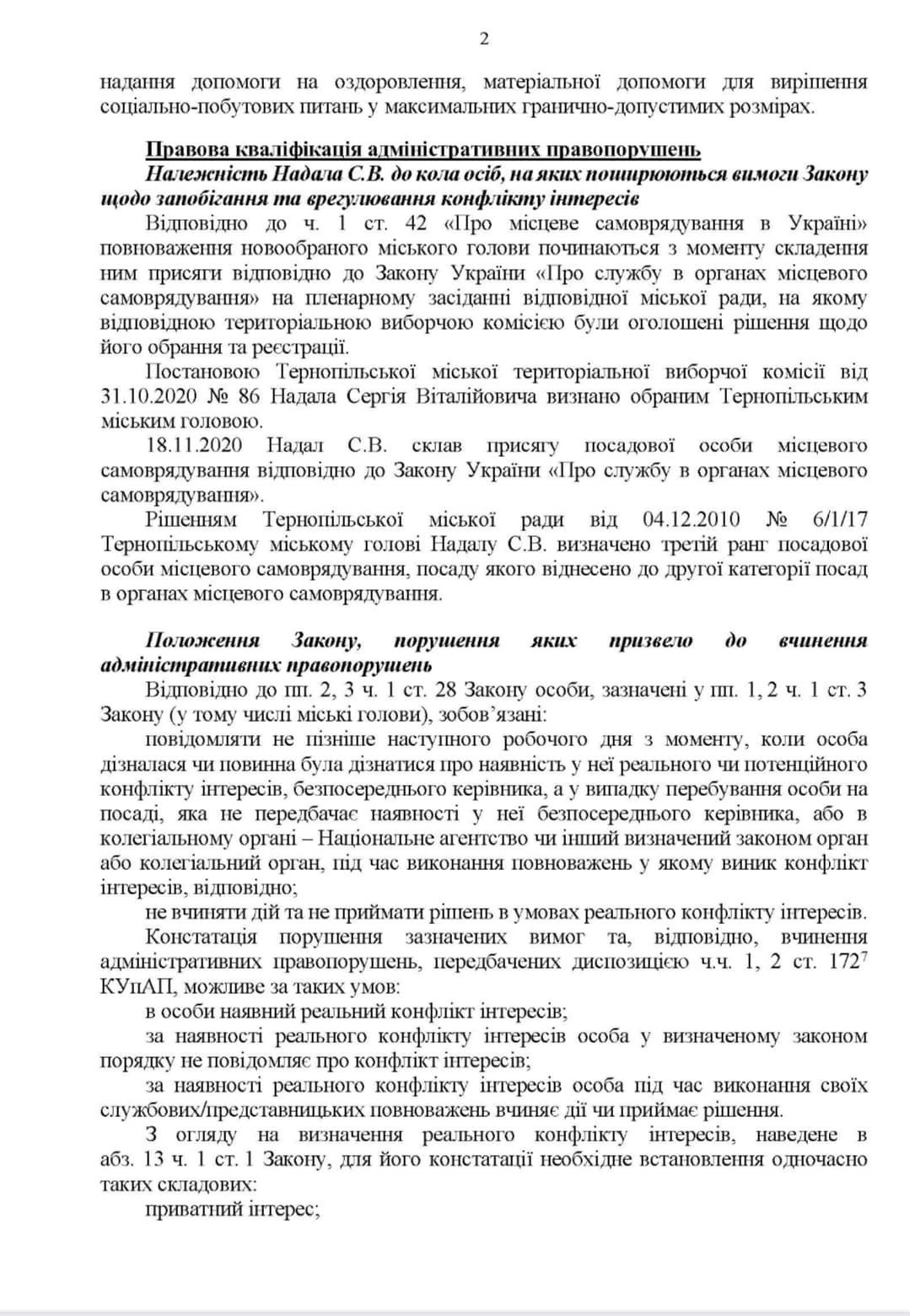 «Діючи в інтересах територіальної громади, Надал С.В., як тернопільський міський голова, мав бути об’єктивним, виконувати свої посадові обов’язки неупереджено та не допускати конфлікту між приватними та публічними інтересами.