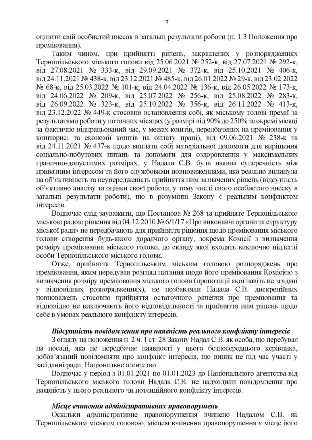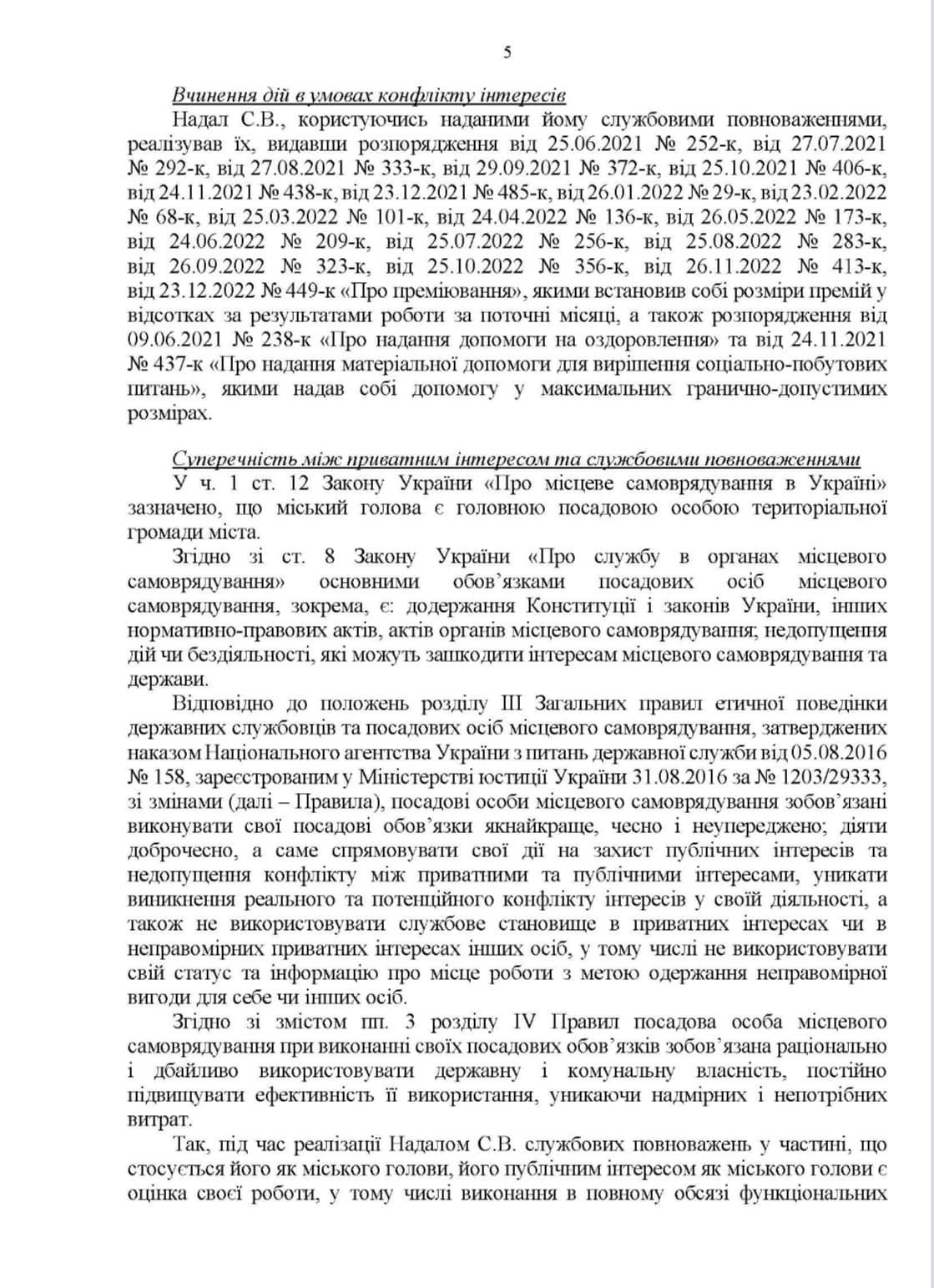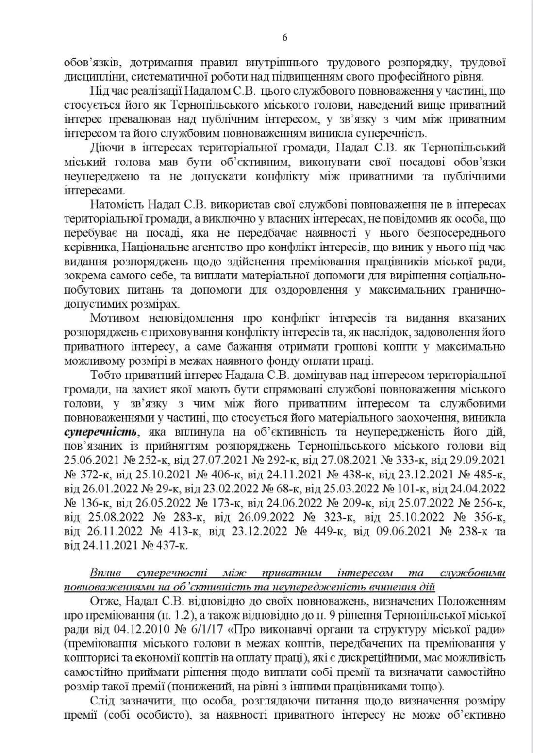 Натомість Надал С.В. використав свої службові повноваження не в інтересах територіальної громади, а виключно у власних інтересах, не повідомив, як особа, що перебуває на посаді, яка не передбачає наявності у нього безпосереднього керівника, Національне агентство про конфлікт інтересів, що виник у нього під час видання розпоряджень щодо здійснення преміювання працівників міської ради, зокрема самого себе, та виплати матеріальної допомоги для вирішення соціально-побутових питань та допомоги на оздоровлення у максимальних, гранично-допустимих розмірах».