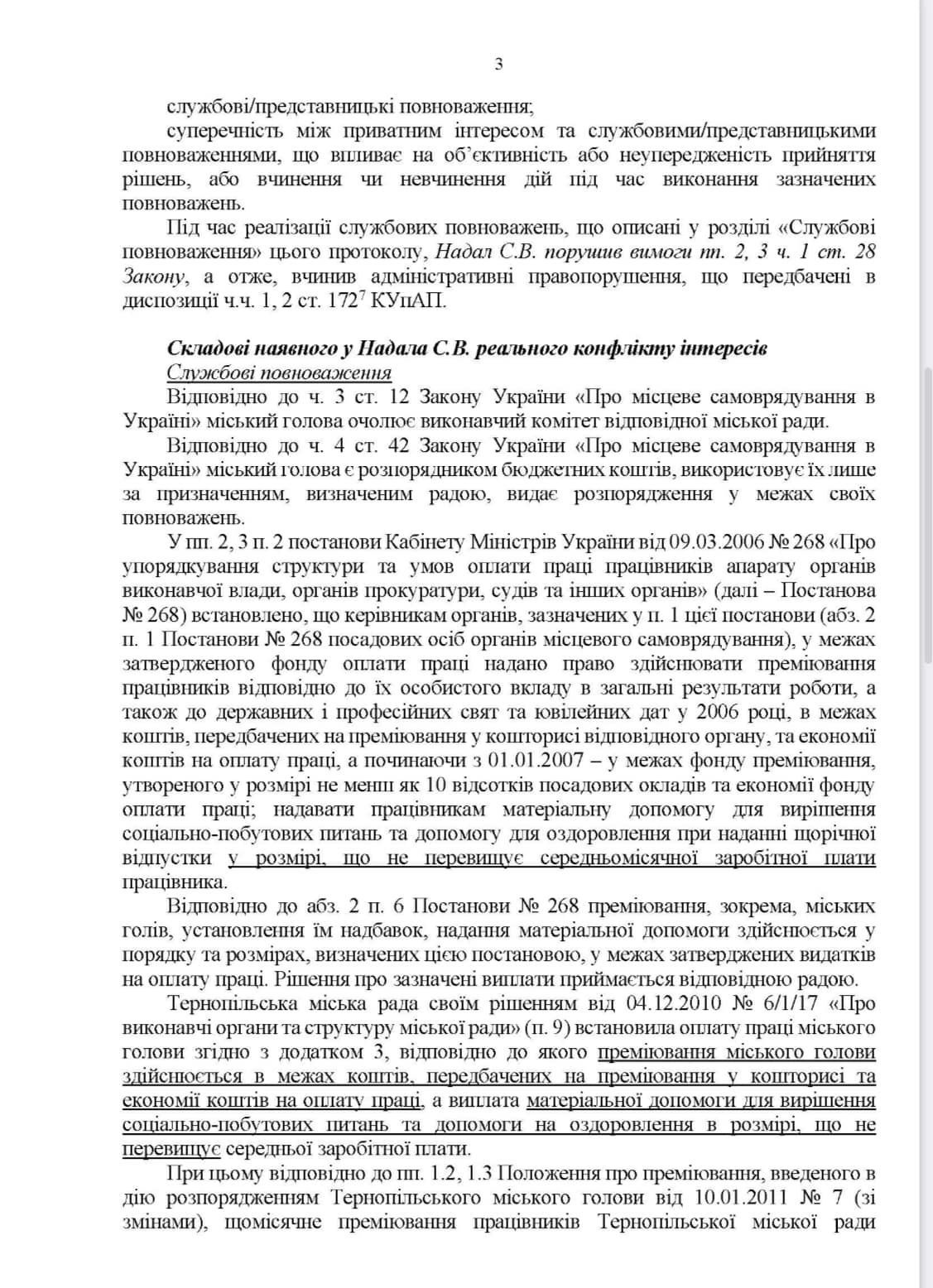 «НАЗК нарешті оприлюднило протокол у соціальних мережах і це стало єдиною можливістю з ним ознайомитися для міського голови Тернополя. Оскільки до цього часу НАЗК не надсилав протокол ні міському голові, ні на адресу Тернопільської міської ради, тим самим порушуючи конституційна права та норми законодавства.