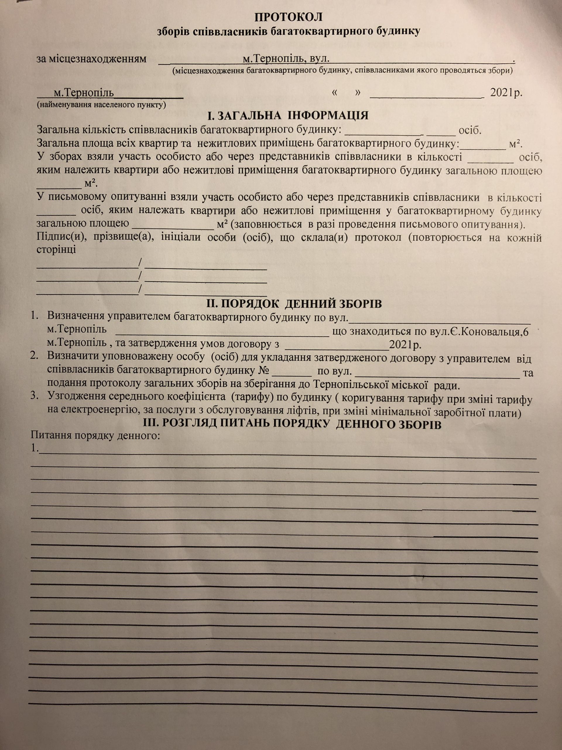 — Представниця одного із обслуговуючих підприємств мені пояснила, що за умови погодження хоча б половини мешканців будинку на продовження управління будинком і обслуговування старим підприємством, товариство й надалі зможе обслуговувати його. Для цього слід вибрати ініціативну групу з мешканців будинку в складі не менше 3-х осіб, оформити відповідний протокол з підписами не менше половини мешканців будинку й передати його міській раді, – розповідає жінка.