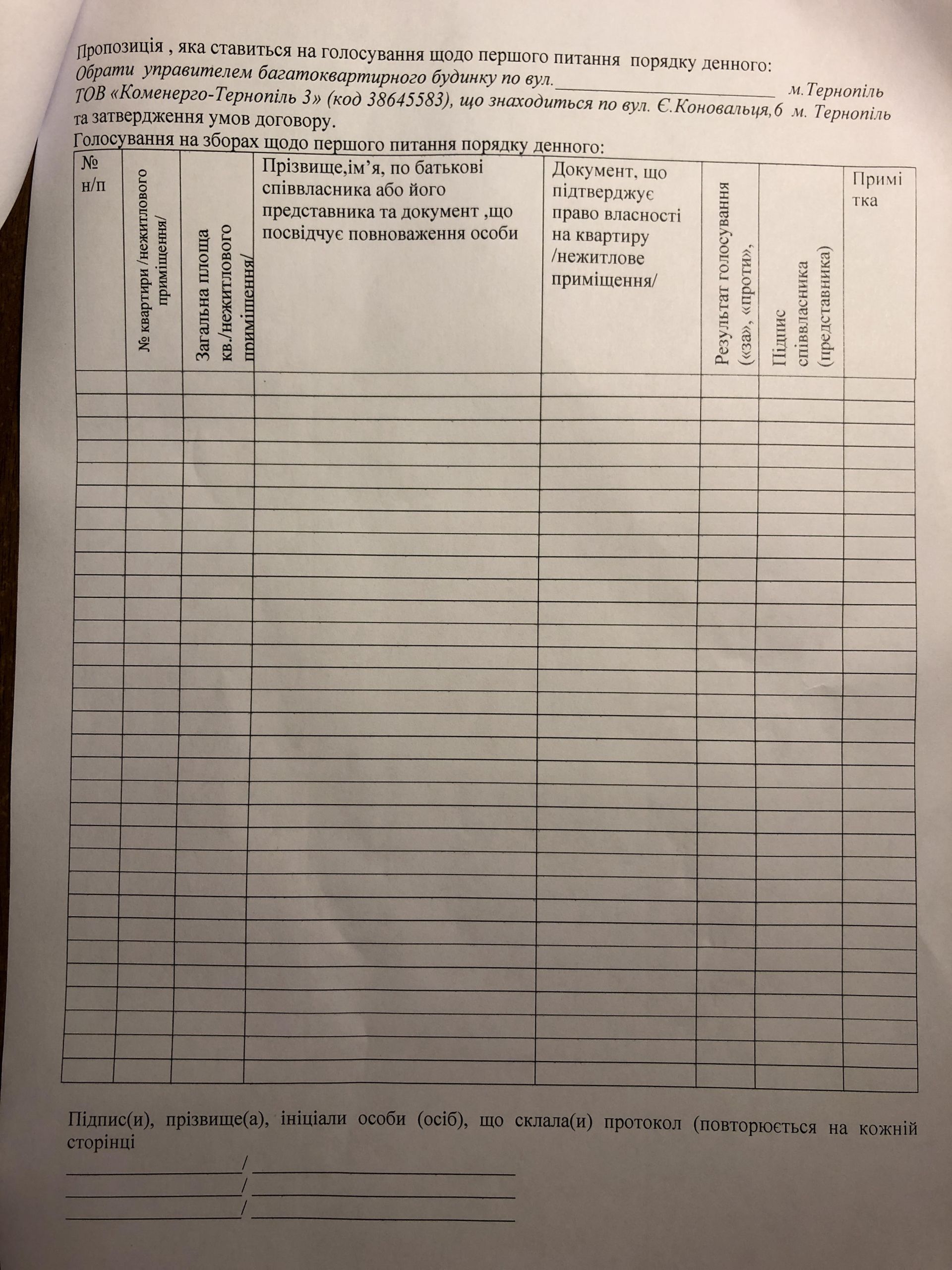 Кожен присутній власник житлового / нежитлового приміщення має визначитися зі своїм голосом – за, проти чи утримався – щодо питання, винесеного на обговорення, зокрема і про створення ОСББ; зазначити обраний варіант у протоколі установчих зборів співвласників багатоквартирного будинку та засвідчити його власним підписом. Крім того, до протоколу також заносять відомості щодо документа, який підтверджує право власності на квартиру / нежитлове приміщення та загальний розмір її (його) площі.