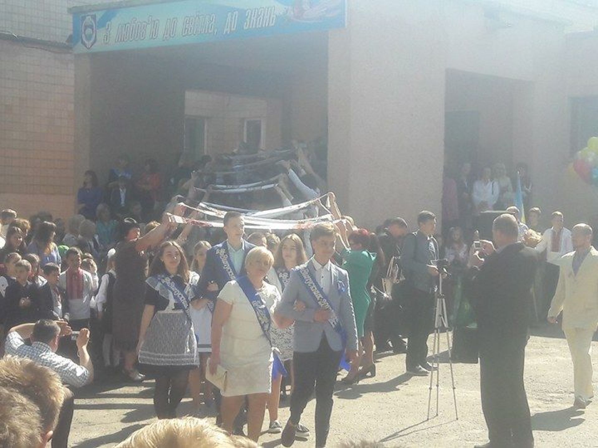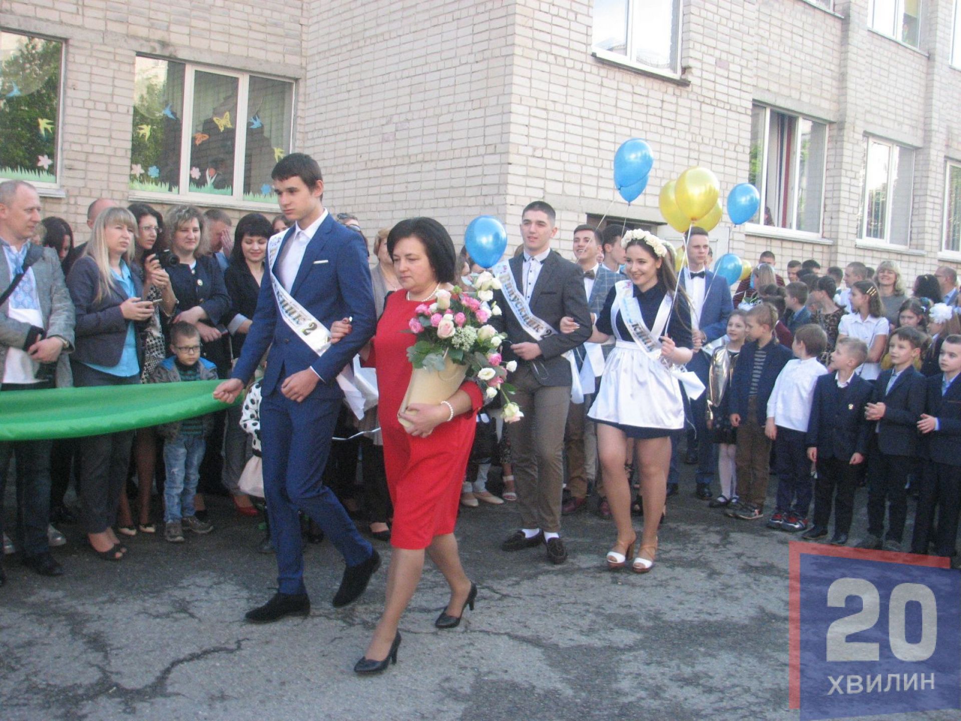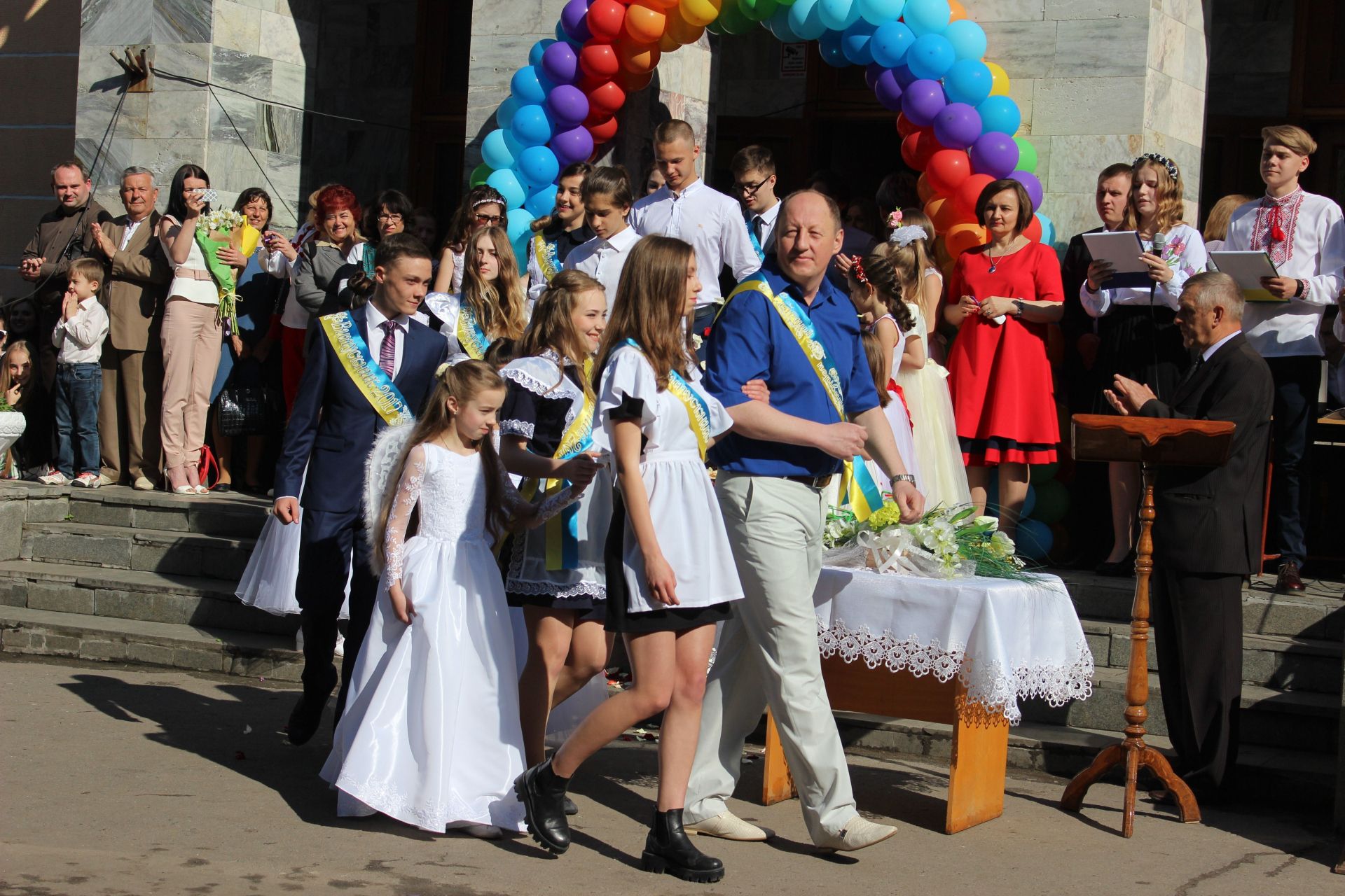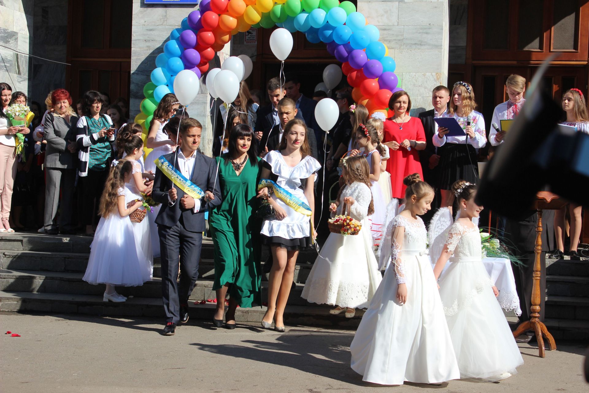 Останній дзвоник у школі № 5 розпочався о 9.00. На урочисту лінійку зібралися вчителі, батьки та школярі з квітами. Випускникам, які які виходили колоною на шкільне подвір’я діти посипали дорогу пелюстками троянд.