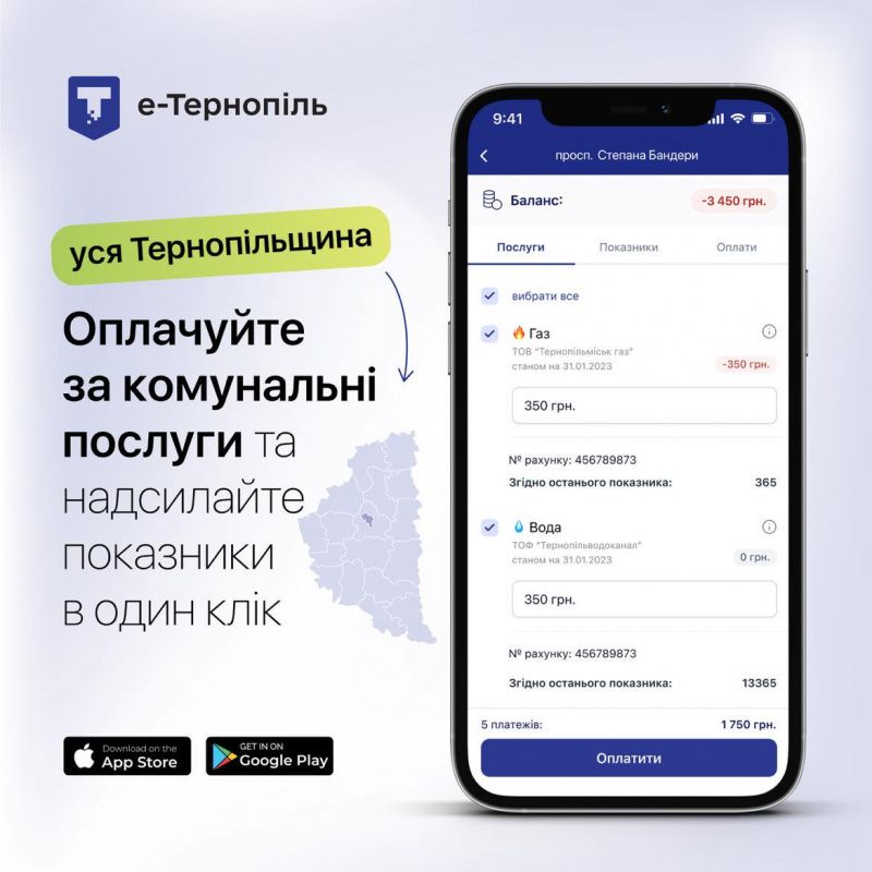 Передати показники та сплатити за комуналку у додатку «е-Тернопіль» можуть жителі усієї Тернопільщини