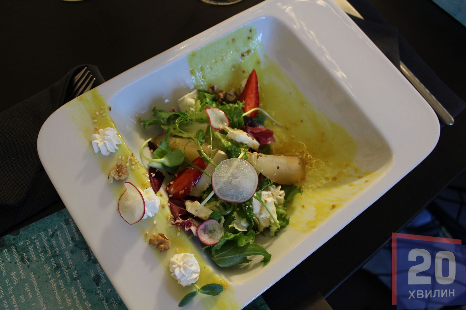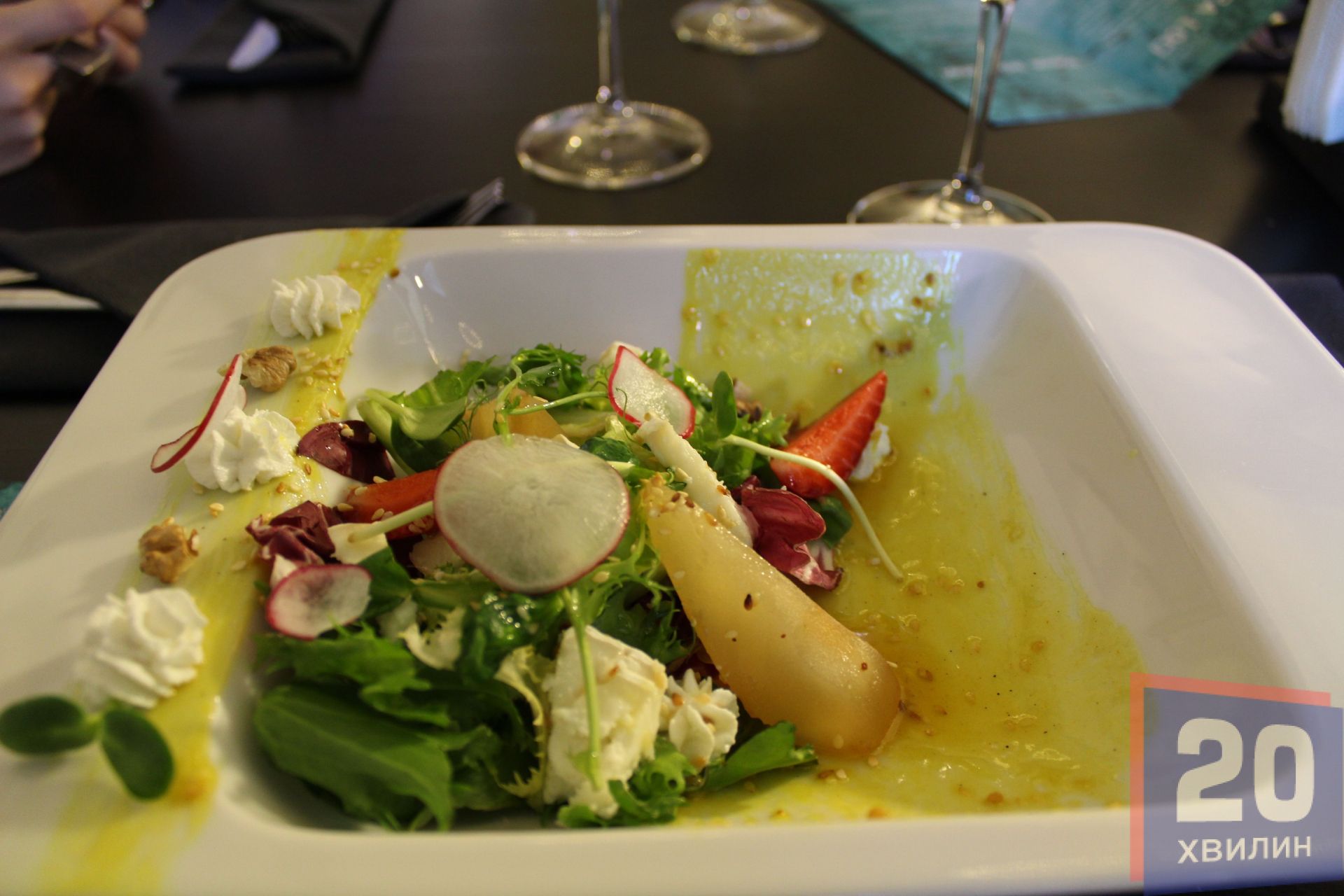Після пива і закусок гості смакували салат, у якому було кілька особливих інгрідієнтів. Шеф-кухар поєднав ніжний козячий сир, горіхи, зелень, полуницю, редиску, соус з конжутом та надзвичайно смачну грушу. Подавали салат з вином.