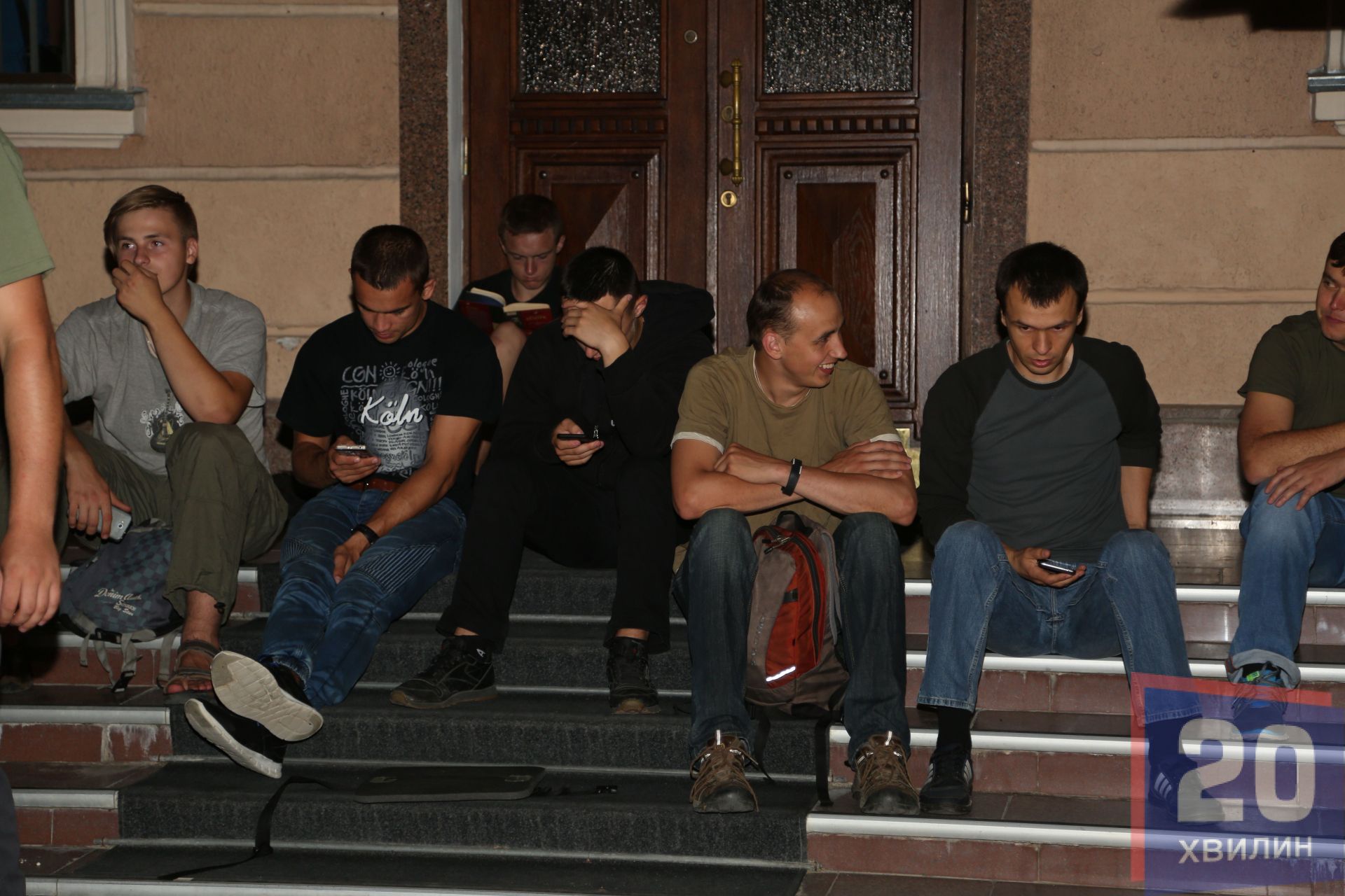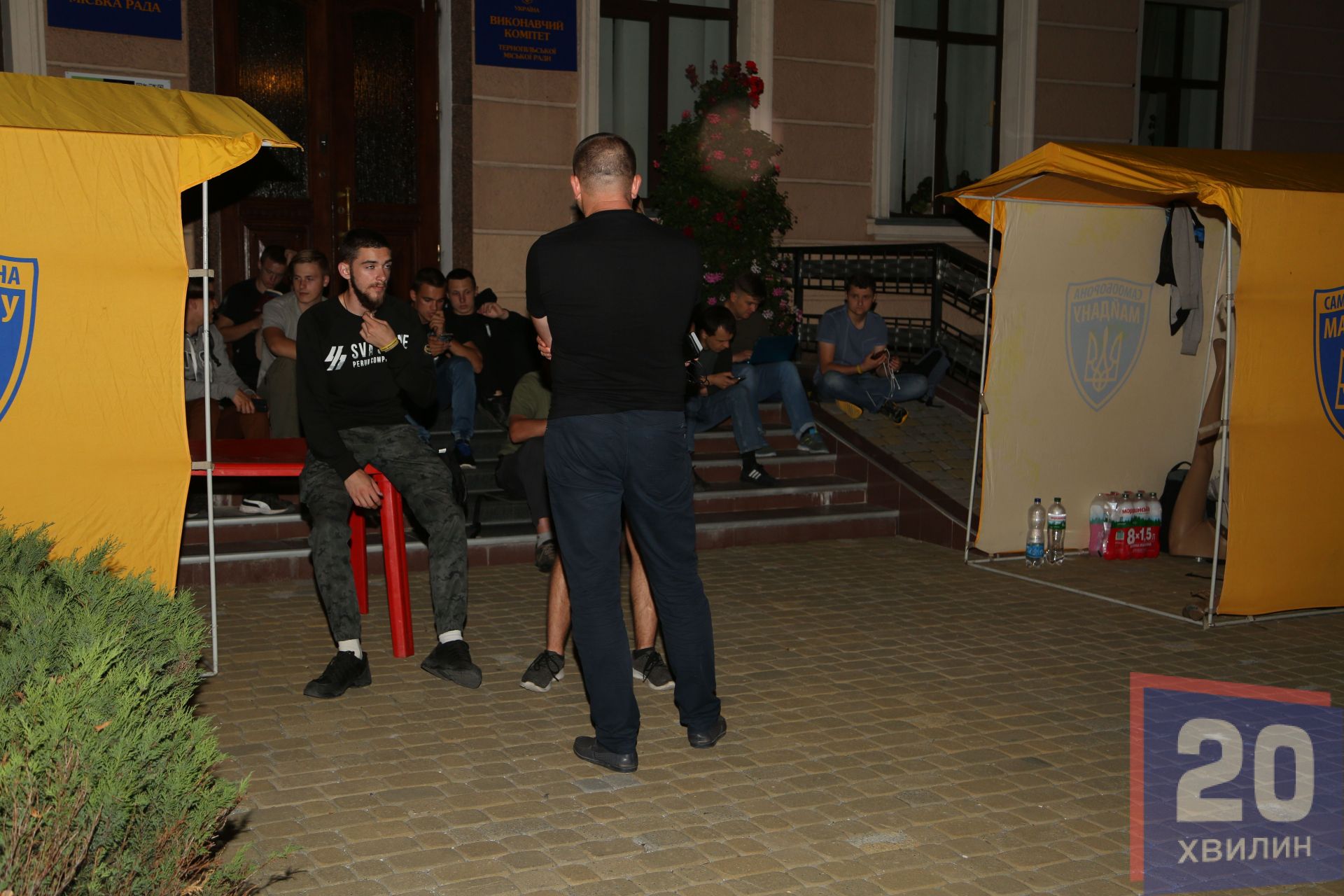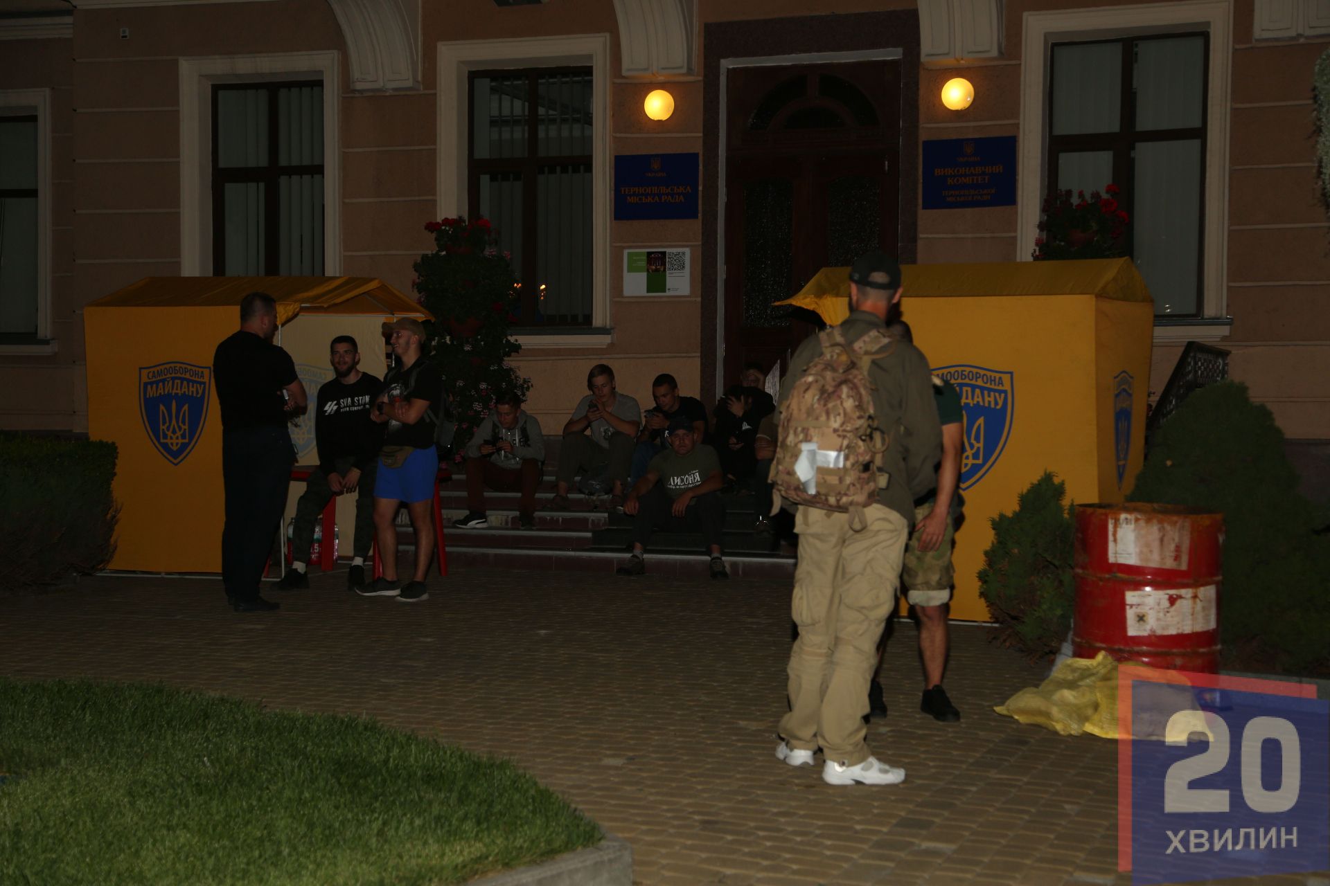 Тернопільські активісти зібралися під стінами міськради увечері 27 липня напередодні сесії. Вона має розпочатися 28 липня о 9.00. Тут можна побачити представників «Автомайдану, «Самооборони».