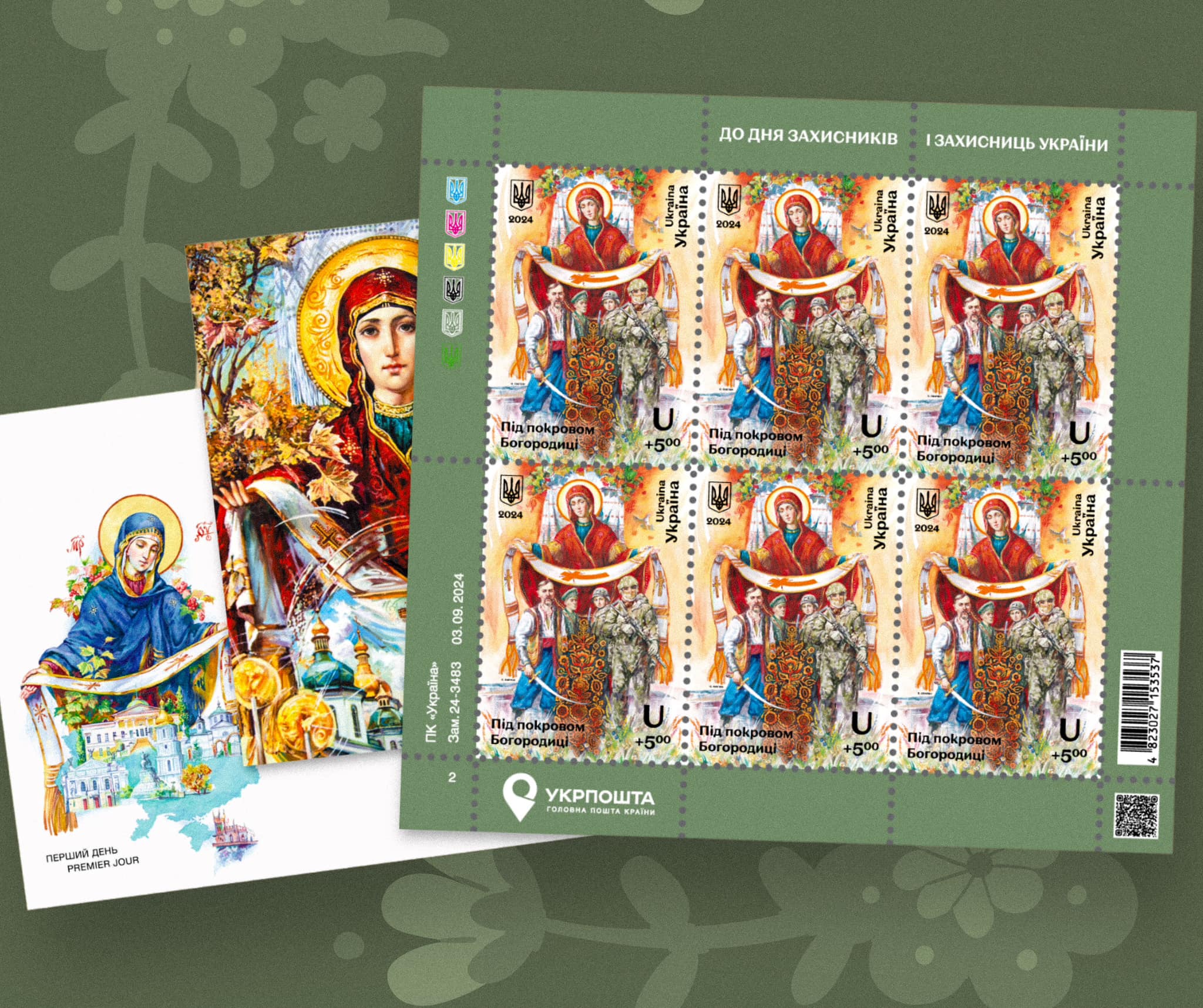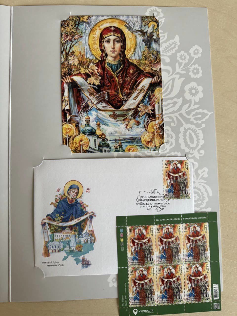 Марку «Під покровом Богородиці» презентували та погасили під час урочистостей до Дня захисників та захисниць України. На марці зображена Пресвята Богородиця, яка «своїм омофором огортає та захищає тих, хто зараз на передовій боронить нашу землю».