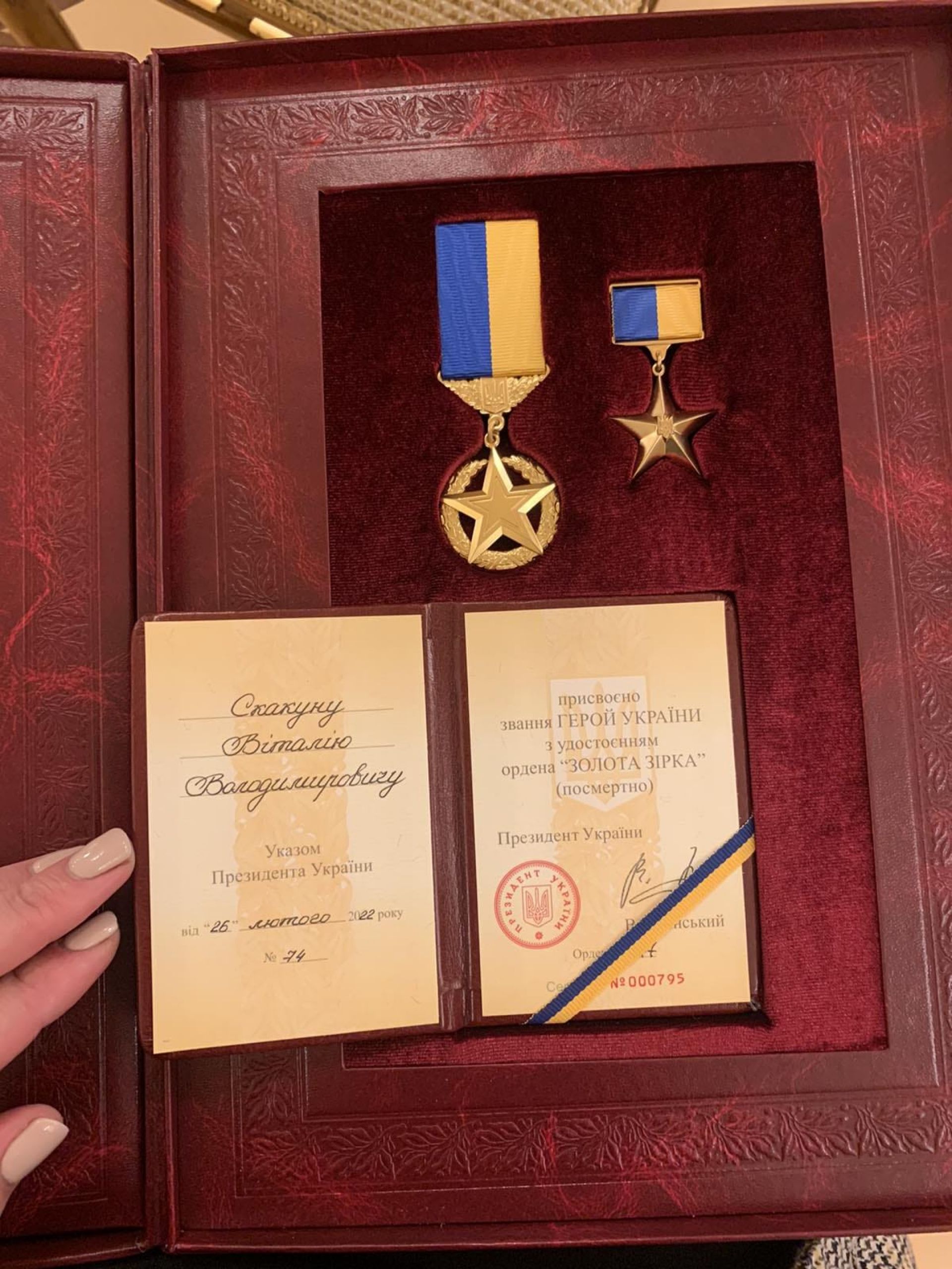 За визначну особисту мужність і героїзм, виявлені у захисті державного суверенітету та територіальної цілісності України, вірність військовій присязі Указом Президента України від 26 лютого 2022 року матрос Віталій Скакун удостоєний звання Герой України з врученням ордена «Золота Зірка» (посмертно).