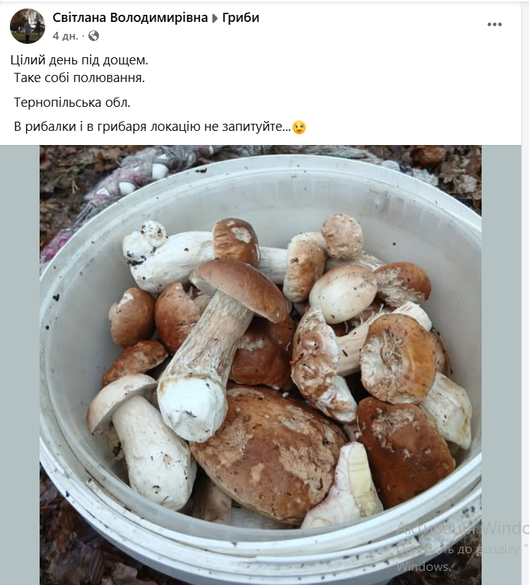 — Цілий день під дощем. Таке собі полювання. Тернопільська обл. В рибалки і в грибаря локацію не запитуйте, — пише Світлана Володимирівна.