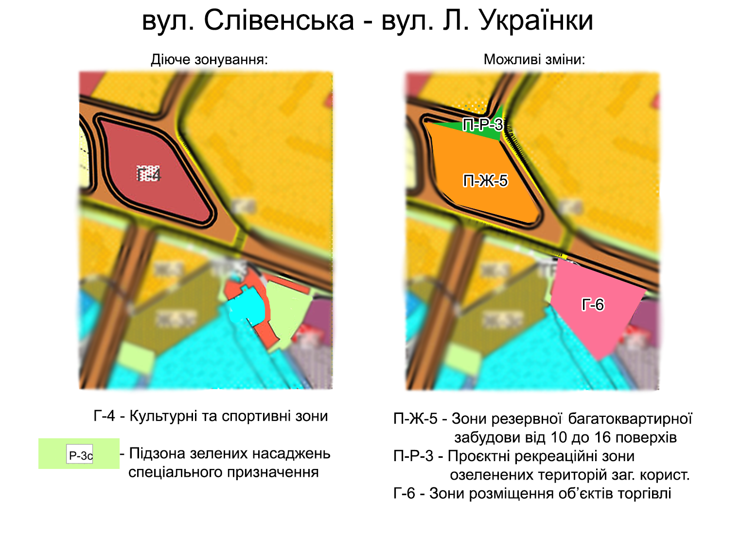 На ділянці біля вулиці Слівенської ростуть зелені насадження. Вона визначена як Г-4 — Культурні та спортивні зони. А на новому плані зонування ця ділянка розділена на дві. Більша частина відповідає зоні П-Ж-5 — Резервної багатоквартирної забудови від 10–ти до 16–ти поверхів. Ще невелика ділянка визначена як Проєктна рекреаційна зона озеленених територій загального користування.
