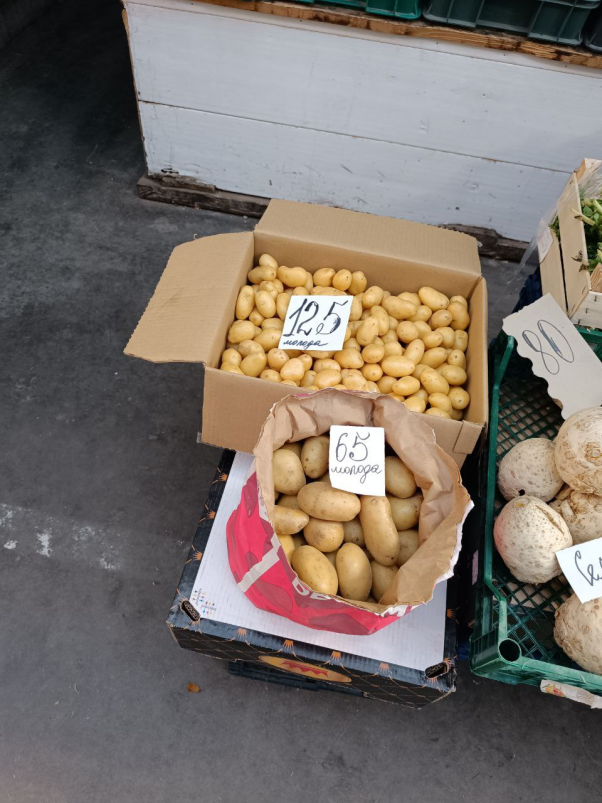 На «Овочевому ринку» у деяких продавців можна знайти молоду картоплю. Її везуть з-за кордону – з Єгипту, кажуть продавці. Ціни значно вищі, ніж на стару українську картоплю.