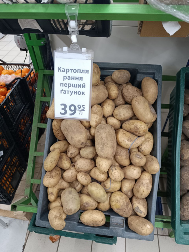 Найдешевша українська картопля коштувала 15 грн/кг в одному з супермаркетів по акційній ціні. Вартість кілограму картоплі сягає майже 40 грн, залежно від її сорту.