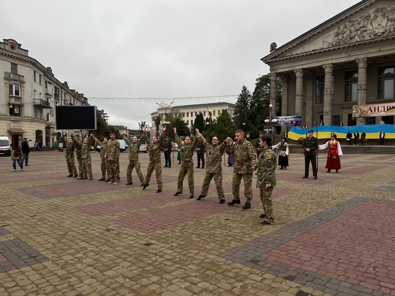 Вже традиційно урочистості розпочали з виконання Державного Гімну України за участю військових. А місцеві колективи виконали патріотичний перформанс з використанням повстанських пісень.