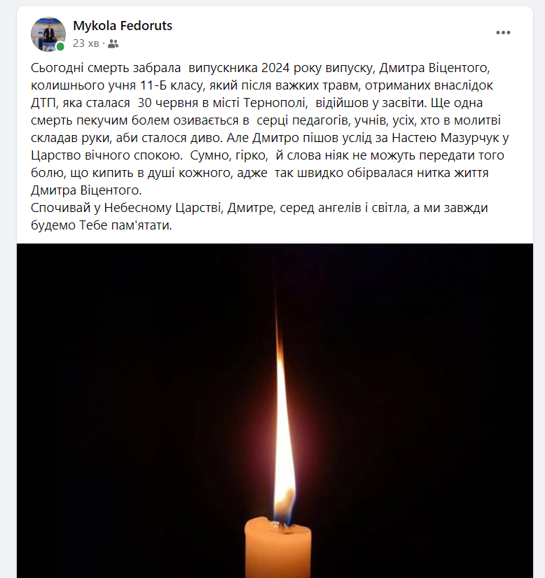 Як стало відомо згодом, зупинилось серце Дмитра Віцентого. Він був учнем 11-Б класу Тернопільского академічного ліцею Українська гімназія ім. Івана Франка. Співчуття висловив директор закладу на своїй сторінці.